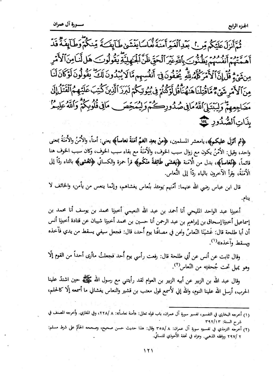 (1) أخرجه البخاري في التفسير تفسير سورة آل عمران باب قوله تعالى: "أمنة نعاسا": 8 / 228 وفي المغازي. وأخرجه المصنف في شرح السنة: 13 / 392.
