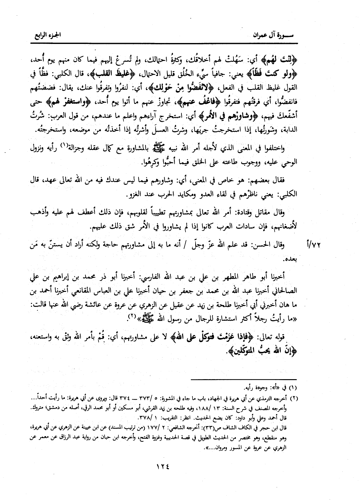 {لِنْتَ لَهُمْ} أَيْ: سَهُلَتْ لَهُمْ أَخْلَاقُكَ وَكَثْرَةُ احْتِمَالِكَ وَلَمْ تُسْرِعْ إِلَيْهِمْ فِيمَا كَانَ مِنْهُمْ يَوْمَ أُحُدٍ، {وَلَوْ كُنْتَ فَظًّا} يعني: جافيًا سيّء الْخُلُقِ قَلِيلَ الِاحْتِمَالِ، {غَلِيظَ الْقَلْبِ} قَالَ الْكَلْبِيُّ: فَظًّا فِي الْقَوْلِ غَلِيظَ الْقَلْبِ فِي الْفِعْلِ، {لَانْفَضُّوا مِنْ حَوْلِكَ} أَيْ: لَنَفَرُوا وَتَفَرَّقُوا عَنْكَ، يُقَالُ: فَضَضْتُهُمُ فَانْفَضُّوا أَيْ فَرَّقْتُهُمْ فَتَفَرَّقُوا {فَاعْفُ عَنْهُمْ} تَجَاوَزْ عَنْهُمْ مَا أَتَوْا يَوْمَ أُحُدٍ، {وَاسْتَغْفِرْ لَهُمْ} حَتَّى أُشَفِّعَكَ فِيهِمْ، {وَشَاوِرْهُمْ فِي الْأَمْرِ} أَيِ: اسْتَخْرِجْ آرَاءَهُمْ وَاعْلَمْ مَا عِنْدَهُمْ مِنْ قَوْلِ الْعَرَبِ: شُرْتُ الدَّابَّةَ وَشَوَّرْتُهَا إِذَا اسْتَخْرَجْتُ جَرْيَهَا وَشُرْتُ الْعَسَلَ وَأَشَرْتُهُ إِذَا أَخَذْتُهُ مِنْ مَوْضِعِهِ وَاسْتَخْرَجْتُهُ.