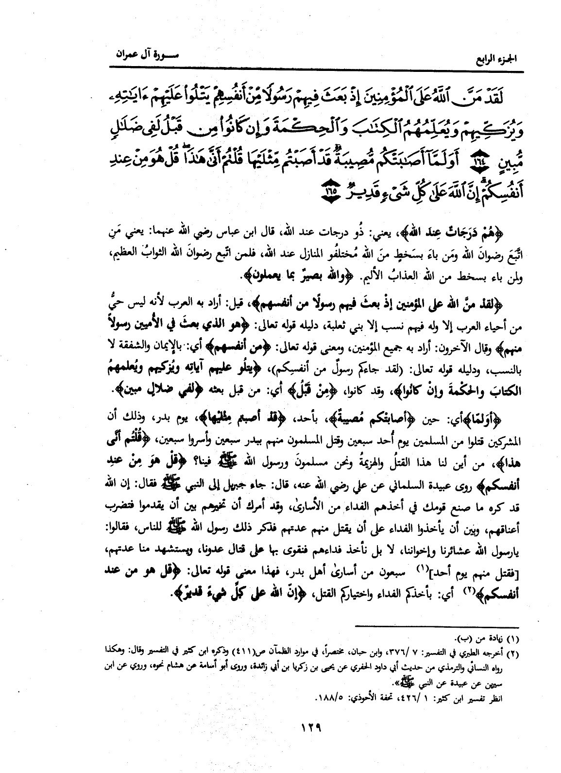 {لَقَدْ مَنَّ اللَّهُ عَلَى الْمُؤْمِنِينَ إِذْ بَعَثَ فِيهِمْ رَسُولًا مِنْ أَنْفُسِهِمْ يَتْلُو عَلَيْهِمْ آيَاتِهِ وَيُزَكِّيهِمْ وَيُعَلِّمُهُمُ الْكِتَابَ وَالْحِكْمَةَ وَإِنْ كَانُوا مِنْ قَبْلُ لَفِي ضَلَالٍ مُبِينٍ (164) أَوَلَمَّا أَصَابَتْكُمْ مُصِيبَةٌ قَدْ أَصَبْتُمْ مِثْلَيْهَا قُلْتُمْ أَنَّى هَذَا قُلْ هُوَ مِنْ عِنْدِ أَنْفُسِكُمْ إِنَّ اللَّهَ عَلَى كُلِّ شَيْءٍ قَدِيرٌ (165) }