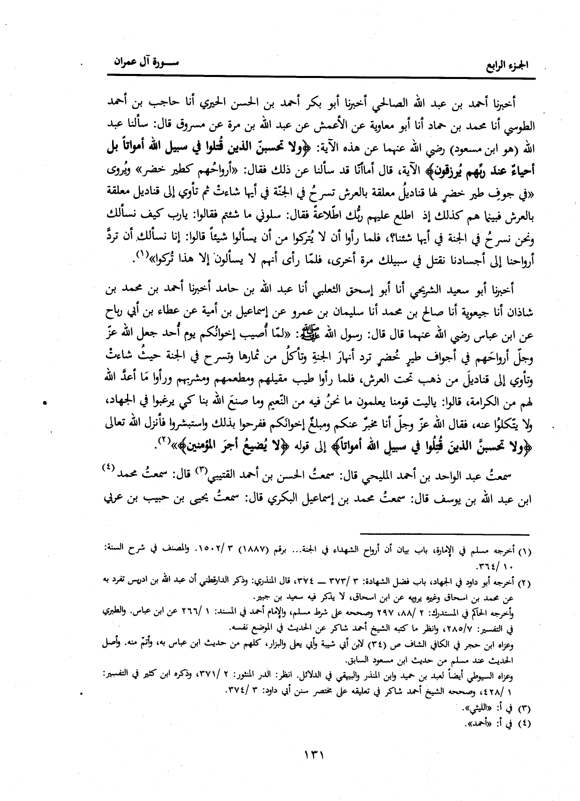أَخْبَرَنَا أَحْمَدُ بْنُ عَبْدِ اللَّهِ الصَّالِحِيُّ، أَخْبَرَنَا أَبُو بَكْرٍ أَحْمَدُ بْنُ الْحَسَنِ الْحِيرِيُّ، أَنَا حَاجِبُ بْنُ أَحْمَدَ الطُّوسِيُّ، أَنَا مُحَمَّدُ بْنُ حَمَّادٍ، أَنَا أَبُو مُعَاوِيَةَ عَنِ الْأَعْمَشِ، عَنْ عَبْدِ اللَّهِ بْنِ مُرَّةَ، عَنْ مَسْرُوقٍ قَالَ: سَأَلْنَا عَبْدَ اللَّهِ (هُوَ بن مَسْعُودٍ) رَضِيَ اللَّهُ عَنْهُمَا عَنْ هَذِهِ الْآيَةِ: {وَلَا تَحْسَبَنَّ الَّذِينَ قُتِلُوا فِي سَبِيلِ اللَّهِ أَمْوَاتًا بَلْ أَحْيَاءٌ عِنْدَ رَبِّهِمْ يُرْزَقُونَ} الْآيَةَ قَالَ أَمَا إِنَّا قَدْ سَأَلْنَا عَنْ ذَلِكَ فَقَالَ: "أَرْوَاحُهُمْ كَطَيْرٍ خُضْرٍ" وَيُرْوَى "فِي جَوْفِ طَيْرٍ خُضْرٍ لَهَا قَنَادِيلُ مُعَلَّقَةٌ بِالْعَرْشِ تَسْرَحُ مِنَ الْجَنَّةِ فِي أَيِّهَا شَاءَتْ ثُمَّ تَأْوِي إِلَى قَنَادِيلَ مُعَلَّقَةٍ بِالْعَرْشِ فَبَيْنَمَا هُمْ كَذَلِكَ إِذِ اطَّلَعَ عَلَيْهِمْ رَبُّكَ اطِّلَاعَةً فَقَالَ: سَلُونِي مَا شِئْتُمْ فَقَالُوا: يَا رَبُّ كَيْفَ نَسْأَلُكَ وَنَحْنُ نَسْرَحُ فِي الْجَنَّةِ فِي أَيِّهَا شِئْنَا؟ فَلَمَّا رَأَوْا أَنْ لَا يُتْرَكُوا مِنْ أَنْ يَسْأَلُوا شَيْئًا قَالُوا: إِنَّا نَسْأَلُكَ أَنْ تَرُدَّ أَرْوَاحَنَا إِلَى أَجْسَادِنَا نُقْتَلُ فِي سَبِيلِكَ مَرَّةً أُخْرَى فَلَمَّا رَأَى أَنَّهُمْ لَا يَسْأَلُونَ إِلَّا هَذَا تُرِكُوا" (1) .