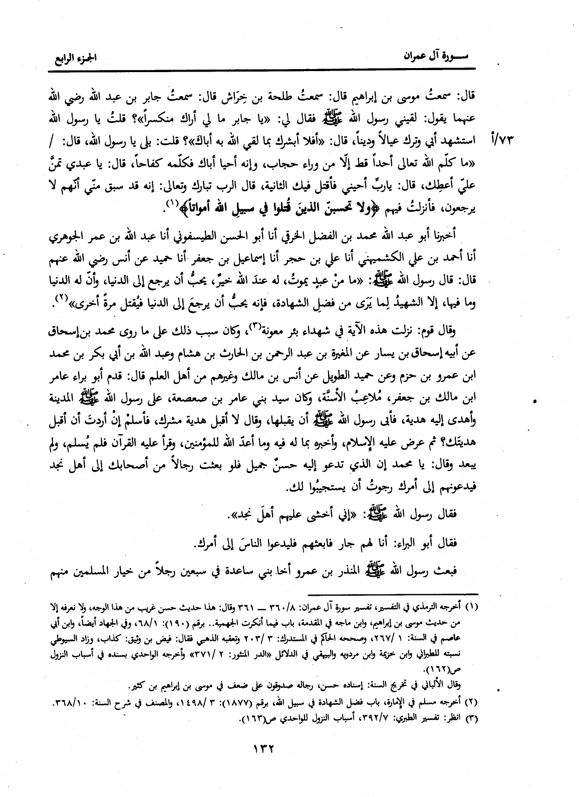 قَالَ: سَمِعْتُ مُوسَى بْنَ إِبْرَاهِيمَ قَالَ: سَمِعْتُ طَلْحَةَ بْنَ خِرَاشٍ قَالَ: سَمِعْتُ جَابِرَ بْنَ عَبْدِ اللَّهِ رَضِيَ اللَّهُ عَنْهُمَا يَقُولُ: لَقِيَنِي رَسُولُ اللَّهِ صَلَّى اللَّهُ عَلَيْهِ وَسَلَّمَ فَقَالَ لِي: "يَا جَابِرُ مَا لِي أَرَاكَ مُنْكَسِرًا"؟ قُلْتُ يَا رَسُولَ اللَّهِ اسْتُشْهِدَ أَبِي وَتَرَكَ عِيَالًا وَدَيْنًا قَالَ: "أَفَلَا أُبَشِّرُكَ بِمَا لَقِيَ اللَّهَ بِهِ أَبَاكَ"؟ قُلْتُ: بَلَى يَا رَسُولَ الله قال: 73/أ "مَا كَلَّمَ اللَّهُ تَعَالَى أَحَدًا قَطُّ إِلَّا مِنْ وَرَاءِ حِجَابٍ، وَإِنَّهُ أَحْيَا أَبَاكَ فَكَلَّمَهُ كِفَاحًا قَالَ: يَا عَبْدِي تَمَنَّ عَلَيَّ أُعْطِكَ قَالَ: يَا رَبِّ أَحْيِنِي فَأُقْتَلُ فِيكَ الثَّانِيَةَ، قَالَ الرَّبُّ تَبَارَكَ وَتَعَالَى: إِنَّهُ قَدْ سَبَقَ مَنِّي أَنَّهُمْ لَا يَرْجِعُونَ فَأُنْزِلَتْ فِيهِمْ {وَلَا تَحْسَبَنَّ الَّذِينَ قُتِلُوا فِي سَبِيلِ اللَّهِ أَمْوَاتًا} (1) .