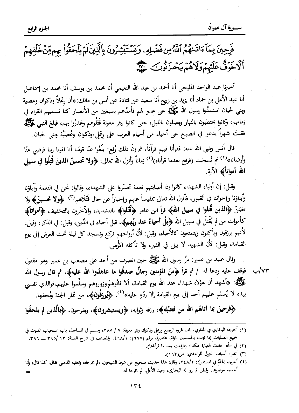 قَالَ أَنَسٌ رَضِيَ اللَّهُ عَنْهُ: فَقَرَأْنَا، فِيهِمْ قُرْآنًا، ثُمَّ إِنَّ ذَلِكَ رُفِعَ: "بَلِّغُوا عَنَّا قَوْمَنَا أَنَّا لَقِينَا رَبَّنَا فَرَضِيَ عَنَّا وَأَرْضَانَا" (1) ثُمَّ نُسِخَتْ (فَرُفِعَ بَعْدَمَا قَرَأْنَاهُ) (2) زَمَانًا وَأَنْزَلَ اللَّهُ تَعَالَى: {وَلَا تَحْسَبَنَّ الَّذِينَ قُتِلُوا فِي سَبِيلِ اللَّهِ أَمْوَاتًا} الْآيَةَ.