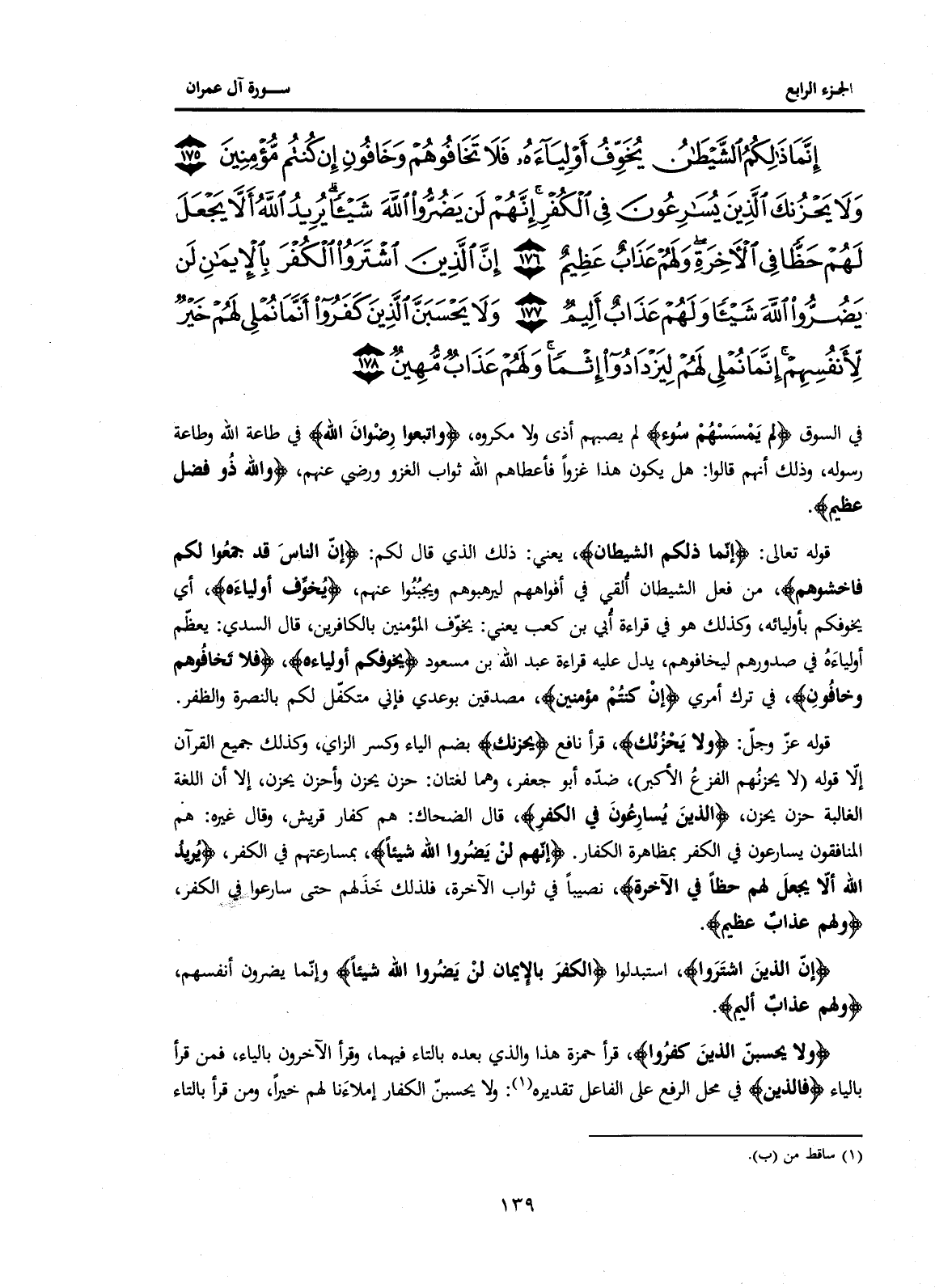 قَوْلُهُ عَزَّ وَجَلَّ: {وَلَا يَحْزُنْكَ} قَرَأَ نَافِعٌ " يُحْزِنُكَ " بِضَمِّ الْيَاءِ وَكَسْرِ الزَّايِ، وَكَذَلِكَ جَمِيعُ الْقُرْآنِ إِلَّا قَوْلَهُ {لَا يَحْزُنُهُمُ الْفَزَعُ الْأَكْبَرُ} ضِدَّهُ أَبُو جَعْفَرٍ وَهُمَا لُغَتَانِ: حَزِنَ يَحْزُنُ وَأَحْزَنَ يُحْزِنُ إِلَّا أَنَّ اللُّغَةَ الْغَالِبَةَ حَزِنَ يَحْزُنُ، {الَّذِينَ يُسَارِعُونَ فِي الْكُفْرِ} قَالَ الضَّحَّاكُ: هُمْ كُفَّارُ قُرَيْشٍ وَقَالَ غَيْرُهُ: هُمُ الْمُنَافِقُونَ يُسَارِعُونَ فِي الْكُفْرِ بِمُظَاهَرَةِ الْكُفَّارِ. {إِنَّهُمْ لَنْ يَضُرُّوا اللَّهَ شَيْئًا} بِمُسَارَعَتِهِمْ فِي الْكُفْرِ، {يُرِيدُ اللَّهُ أَلَّا يَجْعَلَ لَهُمْ حَظًّا فِي الْآخِرَةِ} نَصِيبًا فِي ثَوَابِ الْآخِرَةِ، فَلِذَلِكَ خَذَلَهُمْ حَتَّى سَارَعُوا فِي الْكُفْرِ، {وَلَهُمْ عَذَابٌ عَظِيمٌ}