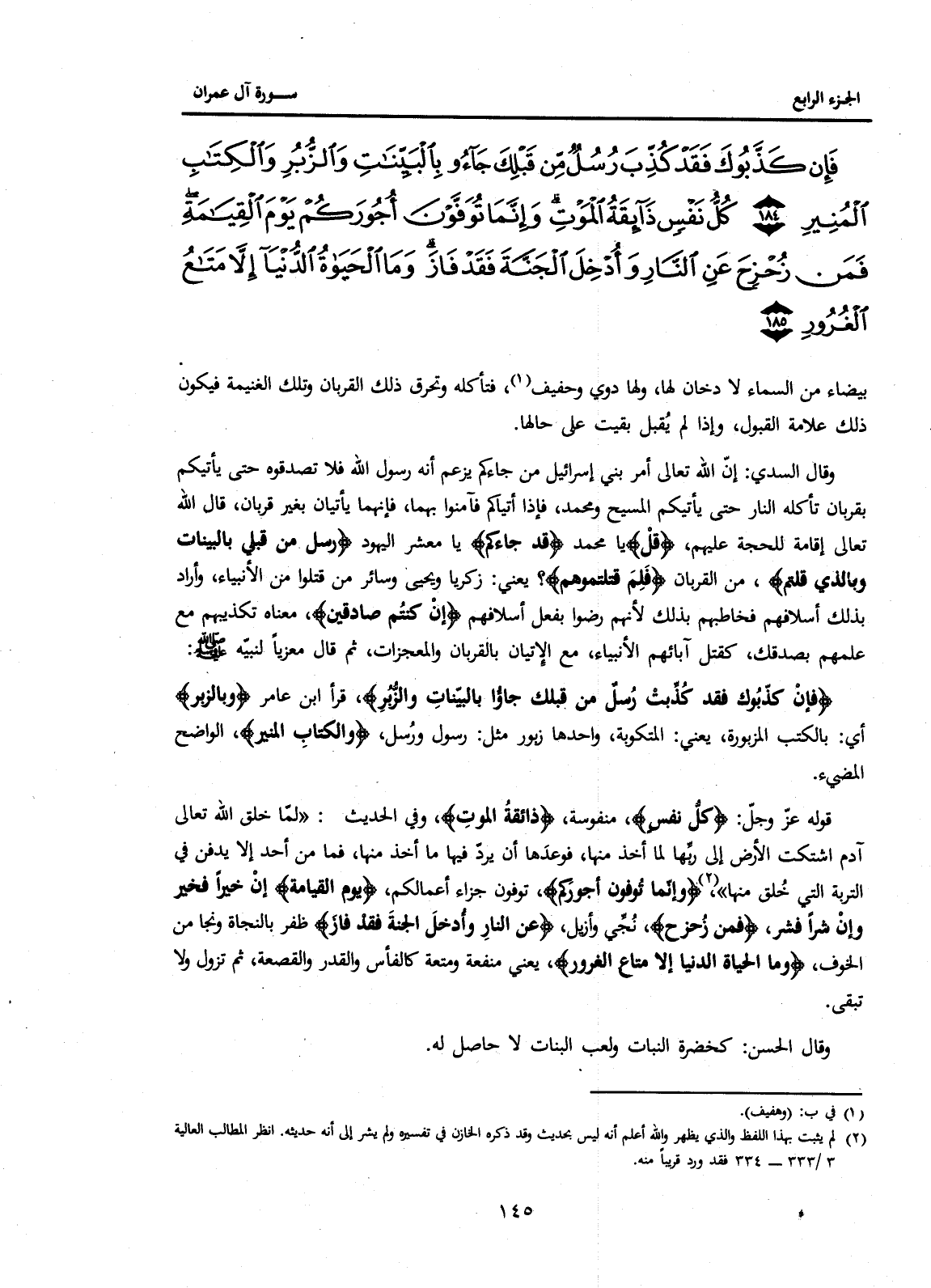 {فَإِنْ كَذَّبُوكَ فَقَدْ كُذِّبَ رُسُلٌ مِنْ قَبْلِكَ جَاءُوا بِالْبَيِّنَاتِ وَالزُّبُرِ وَالْكِتَابِ الْمُنِيرِ (184) كُلُّ نَفْسٍ ذَائِقَةُ الْمَوْتِ وَإِنَّمَا تُوَفَّوْنَ أُجُورَكُمْ يَوْمَ الْقِيَامَةِ فَمَنْ زُحْزِحَ عَنِ النَّارِ وَأُدْخِلَ الْجَنَّةَ فَقَدْ فَازَ وَمَا الْحَيَاةُ الدُّنْيَا إِلَّا مَتَاعُ الْغُرُورِ (185) }