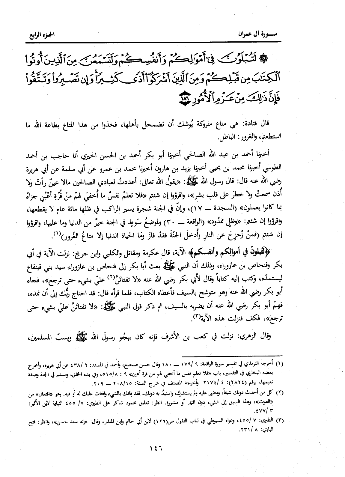 {لَتُبْلَوُنَّ فِي أَمْوَالِكُمْ وَأَنْفُسِكُمْ} الْآيَةَ قَالَ عِكْرِمَةُ وَمُقَاتِلٌ وَالْكَلْبِيُّ وَابْنُ جُرَيْجٍ: نَزَلَتِ الْآيَةُ فِي أَبِي بَكْرٍ وَفِنْحَاصَ بْنِ عَازُورَاءَ. وَذَلِكَ أَنَّ النَّبِيَّ صَلَّى اللَّهُ عَلَيْهِ وَسَلَّمَ بَعَثَ أَبَا بَكْرٍ إِلَى فِنْحَاصَ بْنِ عَازُورَاءَ سَيِّدِ بَنِي قَيْنُقَاعَ لِيَسْتَمِدَّهُ، وَكَتَبَ إِلَيْهِ كِتَابًا وَقَالَ لِأَبِي بَكْرٍ رَضِيَ اللَّهُ عَنْهُ "لَا تَفْتَاتَنَّ (2) عَلَيَّ بِشَيْءٍ حَتَّى تَرْجِعَ" فَجَاءَ أَبُو بَكْرٍ رَضِيَ اللَّهُ عَنْهُ وَهُوَ مُتَوَشِّحٌ بِالسَّيْفِ فَأَعْطَاهُ الْكِتَابَ فَلَمَّا قَرَأَهُ قَالَ: قَدِ احْتَاجَ رَبُّكَ إِلَى أَنْ نُمِدَّهُ، فَهَمَّ أَبُو بَكْرٍ رَضِيَ اللَّهُ عَنْهُ أَنْ يَضْرِبَهُ بِالسَّيْفِ ثُمَّ ذَكَرَ قَوْلَ النَّبِيِّ صَلَّى اللَّهُ عَلَيْهِ وَسَلَّمَ: "لَا تَفْتَاتَنَّ عَلَيَّ بِشَيْءٍ حَتَّى تَرْجِعَ" فَكَفَّ فَنَزَلَتْ هَذِهِ الْآيَةُ (3) .