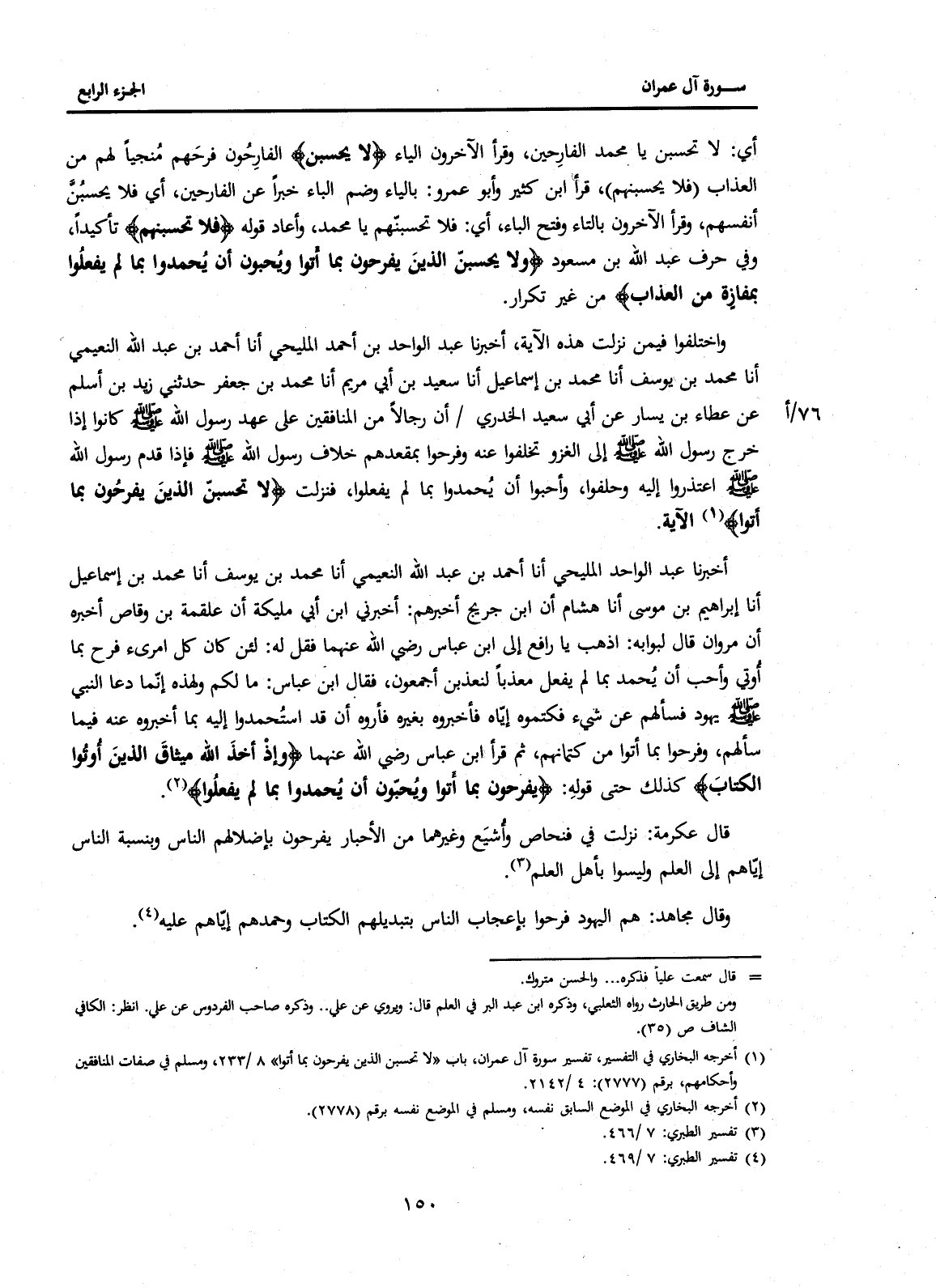وَاخْتَلَفُوا فِيمَنْ نَزَلَتْ هَذِهِ الْآيَةُ أَخْبَرَنَا عَبْدُ الْوَاحِدِ بْنُ أَحْمَدَ الْمُلَيْحِيُّ، أَنَا أَحْمَدُ بْنُ عَبْدِ اللَّهِ النُّعَيْمِيُّ، أَنَا مُحَمَّدُ بْنُ يُوسُفَ، أَنَا مُحَمَّدُ بْنُ إِسْمَاعِيلَ، أَنَا سَعِيدُ بْنُ أَبِي مَرْيَمَ، أَنَا مُحَمَّدُ بْنُ جَعْفَرٍ، حَدَّثَنِي زَيْدُ بْنُ أَسْلَمَ، عَنْ عَطَاءِ بْنِ يَسَارٍ عَنْ أَبِي سعيد الخدري 76/أأَنَّ رِجَالًا مِنَ الْمُنَافِقِينَ عَلَى عَهْدِ رَسُولِ اللَّهِ صَلَّى اللَّهُ عَلَيْهِ وَسَلَّمَ كَانُوا إِذَا خَرَجَ رَسُولُ اللَّهِ صَلَّى اللَّهُ عَلَيْهِ وَسَلَّمَ إِلَى الْغَزْوِ تَخَلَّفُوا عَنْهُ وَفَرِحُوا بِمَقْعَدِهِمْ خِلَافَ رَسُولِ اللَّهِ صَلَّى اللَّهُ عَلَيْهِ وَسَلَّمَ فَإِذَا قَدِمَ رَسُولُ اللَّهِ صَلَّى اللَّهُ عَلَيْهِ وَسَلَّمَ اعْتَذَرُوا إِلَيْهِ وَحَلَفُوا، وَأَحَبُّوا أَنْ يُحْمَدُوا بِمَا لَمْ يَفْعَلُوا، فَنَزَلَتْ {لَا تَحْسَبَنَّ الَّذِينَ يَفْرَحُونَ بِمَا أَتَوْا} (1) الْآيَةَ.