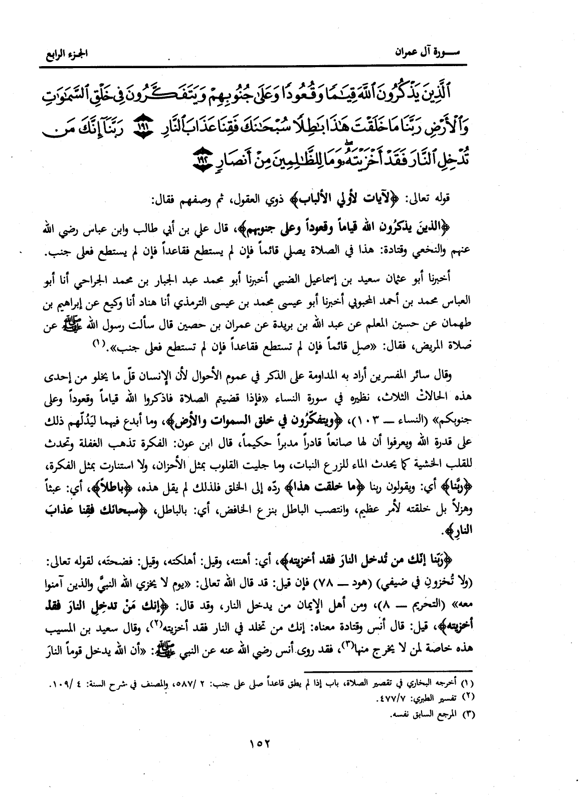 وَقَالَ سَائِرُ الْمُفَسِّرِينَ أَرَادَ بِهِ الْمُدَاوَمَةَ عَلَى الذِّكْرِ فِي عُمُومِ الْأَحْوَالِ لِأَنَّ الْإِنْسَانَ قَلَّ مَا يَخْلُو مِنْ إِحْدَى هَذِهِ الْحَالَاتِ الثَّلَاثِ، نَظِيرُهُ فِي سُورَةِ النِّسَاءِ "فَإِذَا قَضَيْتُمُ الصَّلَاةَ فَاذْكُرُوا اللَّهَ قِيَامًا وَقُعُودًا وَعَلَى جُنُوبِكُمْ" {النِّسَاءِ -103} ، {وَيَتَفَكَّرُونَ فِي خَلْقِ السَّمَاوَاتِ وَالْأَرْضِ} وَمَا أَبْدَعَ فِيهِمَا لِيَدُلَّهُمْ ذَلِكَ عَلَى قُدْرَةِ اللَّهِ وَيَعْرِفُوا أَنَّ لَهَا صَانِعًا قَادِرًا مُدَبِّرًا حَكِيمًا قَالَ ابْنُ عَوْنٍ: الْفِكْرَةُ تُذْهِبُ الْغَفْلَةَ وَتُحْدِثُ لِلْقَلْبِ الْخَشْيَةَ كَمَا يُحْدِثُ الْمَاءُ لِلزَّرْعِ النَّبَاتَ، وَمَا جُلِيَتِ الْقُلُوبُ بِمِثْلِ الْأَحْزَانِ وَلَا اسْتَنَارَتْ بِمِثْلِ الْفِكْرَةِ، {رَبَّنَا} أَيْ: وَيَقُولُونَ رَبَّنَا {مَا خَلَقْتَ هَذَا} رَدَّهُ إِلَى الْخَلْقِ فَلِذَلِكَ لَمْ يَقُلْ هَذِهِ، {بَاطِلًا} أَيْ: عَبَثًا وَهَزْلَا بَلْ خَلَقْتَهُ لِأَمْرٍ عَظِيمٍ وَانْتَصَبَ الْبَاطِلُ بِنَزْعِ الْخَافِضِ، أَيْ: بِالْبَاطِلِ، {سُبْحَانَكَ فَقِنَا عَذَابَ النَّارِ}