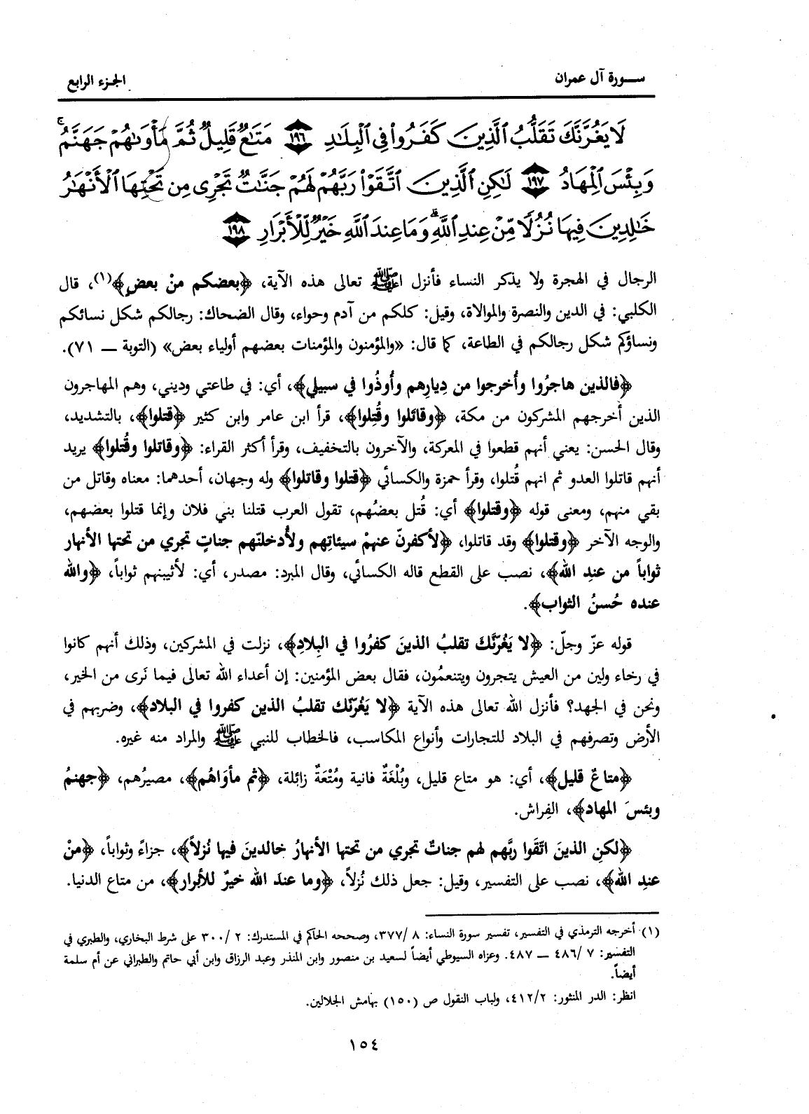 {فَالَّذِينَ هَاجَرُوا وَأُخْرِجُوا مِنْ دِيَارِهِمْ وَأُوذُوا فِي سَبِيلِي} أَيْ: فِي طَاعَتِي وَدِينِي، وَهُمُ الْمُهَاجِرُونَ الَّذِينَ أَخْرَجَهُمُ الْمُشْرِكُونَ مِنْ مَكَّةَ، {وَقَاتَلُوا وَقُتِلُوا} قَرَأَ ابْنُ عَامِرٍ وَابْنُ كَثِيرٍ " وَقُتِّلُوا " بِالتَّشْدِيدِ وَقَالَ الْحَسَنُ: يَعْنِي أَنَّهُمْ قُطِّعُوا فِي الْمَعْرَكَةِ، وَالْآخَرُونَ بِالتَّخْفِيفِ وَقَرَأَ أَكْثَرُ الْقُرَّاءِ: {وَقَاتَلُوا وَقُتِلُوا} يُرِيدُ أَنَّهُمْ قَاتَلُوا الْعَدُوَّ ثُمَّ أَنَّهُمْ قُتِلُوا وَقَرَأَ حَمْزَةُ وَالْكِسَائِيُّ {وَقُتِلُوا وَقَاتَلُوا} وَلَهُ وَجْهَانِ أَحَدُهُمَا: مَعْنَاهُ وَقَاتَلَ مَنْ بَقِيَ مِنْهُمْ، وَمَعْنَى قَوْلِهِ {وَقُتِلُوا} أَيْ: قُتِلَ بَعْضُهُمْ تَقُولُ الْعَرَبُ قَتَلْنَا بَنِي فُلَانٍ وَإِنَّمَا قَتَلُوا بَعْضَهُمْ وَالْوَجْهُ الْآخَرُ {وَقُتِلُوا} وَقَدْ قَاتَلُوا، {لَأُكَفِّرَنَّ عَنْهُمْ سَيِّئَاتِهِمْ وَلَأُدْخِلَنَّهُمْ جَنَّاتٍ تَجْرِي مِنْ تَحْتِهَاالأنْهَار ثَوَابًا مِنْ عِنْدِ اللَّهِ} نُصِبَ عَلَى الْقَطْعِ قَالَهُ الْكِسَائِيُّ، وَقَالَ الْمُبَرِّدُ: مَصْدَرٌ أَيْ: لَأُثِيبَنَّهُمْ ثَوَابًا، {وَاللَّهُ عِنْدَهُ حُسْنُ الثَّوَابِ}