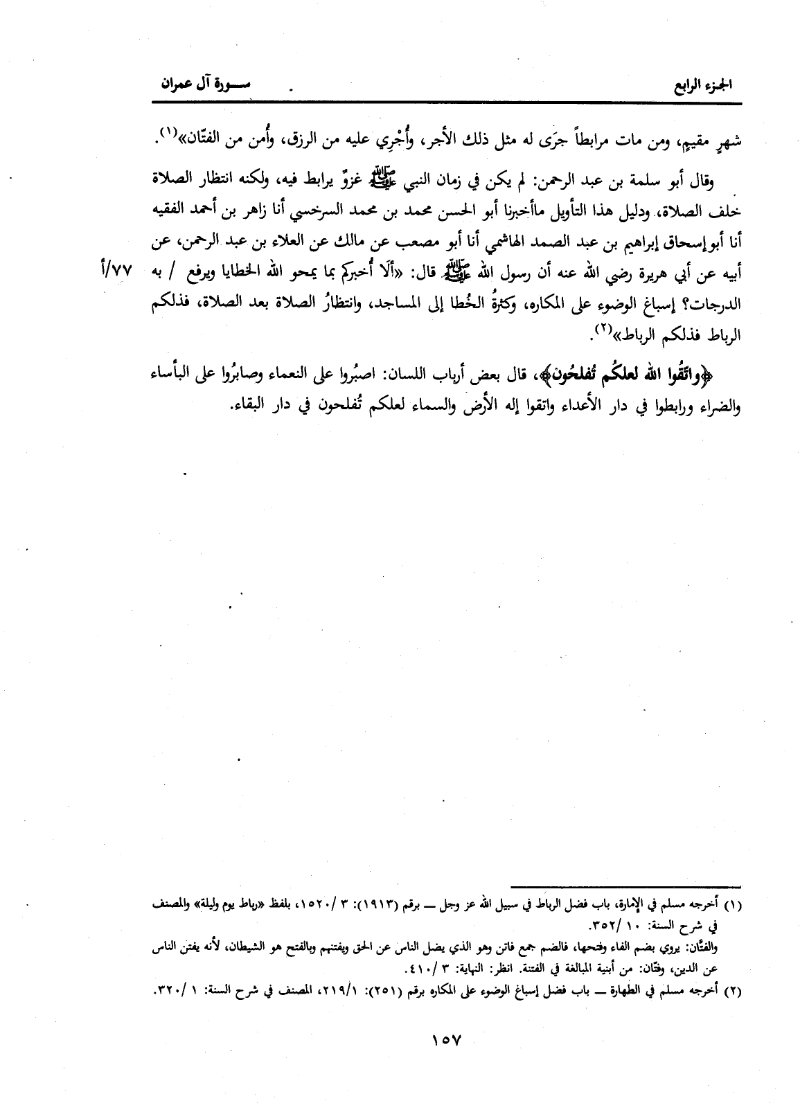 وَقَالَ أَبُو سَلَمَةَ بْنُ عَبْدِ الرَّحْمَنِ: لَمْ يَكُنْ فِي زَمَانِ النَّبِيِّ صَلَّى اللَّهُ عَلَيْهِ وَسَلَّمَ غَزْوٌ يُرَابَطُ فِيهِ، وَلَكِنَّهُ انْتِظَارُ الصَّلَاةِ خَلْفَ الصَّلَاةِ، وَدَلِيلُ هَذَا التَّأْوِيلِ مَا أَخْبَرَنَا أَبُو الْحَسَنِ مُحَمَّدُ بْنُ مُحَمَّدٍ السَّرَخْسِيُّ، أَنَا زَاهِرُ بْنُ أَحْمَدَ الْفَقِيهُ، أَنَا أَبُو إِسْحَاقَ إِبْرَاهِيمُ بْنُ عَبْدِ الصَّمَدِ الْهَاشِمِيُّ، أَنَا أَبُو مُصْعَبٍ، عَنْ مَالِكٍ، عَنِ الْعَلَاءِ بْنِ عَبْدِ الرَّحْمَنِ، عَنْ أَبِيهِ عَنْ أَبِي هُرَيْرَةَ رَضِيَ اللَّهُ عَنْهُ أَنَّ رَسُولَ اللَّهِ صَلَّى اللَّهُ عَلَيْهِ وَسَلَّمَ قَالَ: "أَلَا أُخْبِرُكُمْ بِمَا يَمْحُو اللَّهُ الخطايا ويرفع 77/أبِهِ الدَّرَجَاتِ؟ إِسْبَاغُ الْوُضُوءِ عَلَى الْمَكَارِهِ، وَكَثْرَةُ الْخُطَا إِلَى الْمَسَاجِدِ، وَانْتِظَارُ الصَّلَاةِ بَعْدَ الصَّلَاةِ، فَذَلِكُمُ الرِّبَاطُ فَذَلِكُمُ الرِّبَاطُ" (2) .