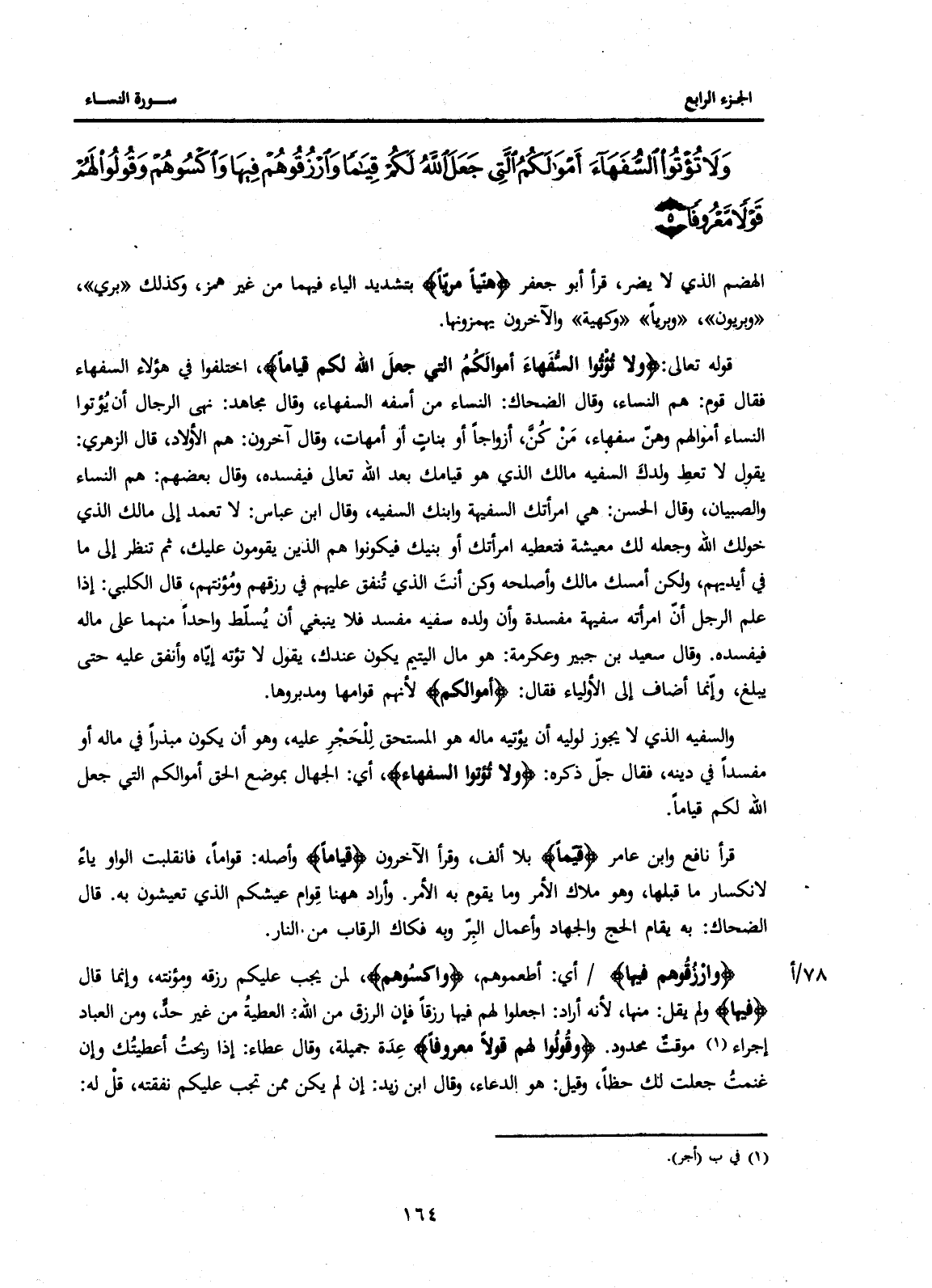 قَوْلُهُ تَعَالَى: {وَلَا تُؤْتُوا السُّفَهَاءَ أَمْوَالَكُمُ الَّتِي جَعَلَ اللَّهُ لَكُمْ قِيَامًا} اخْتَلَفُوا فِي هَؤُلَاءِ السُّفَهَاءِ فَقَالَ قَوْمٌ: هُمُ النِّسَاءُ، وَقَالَ الضَّحَّاكُ: النِّسَاءُ مِنْ أَسْفَهِ السُّفَهَاءِ، وَقَالَ مُجَاهِدٌ: نَهَى الرِّجَالَ أَنْ يُؤْتُوا النِّسَاءَ أَمْوَالَهُمْ وَهُنَّ سُفَهَاءُ، مَنْ كُنَّ، أَزْوَاجًا أَوْ بَنَاتٍ أَوْ أُمَّهَاتٍ، وَقَالَ آخَرُونَ: هُمُ الْأَوْلَادُ، قَالَ الزُّهْرِيُّ: يَقُولُ لَا تُعْطِ وَلَدَكَ السَّفِيهَ مَالَكَ الَّذِي هُوَ قِيَامُكَ بَعْدَ اللَّهِ تَعَالَى فَيُفْسِدُهُ، وَقَالَ بَعْضُهُمْ: هُمُ النِّسَاءُ وَالصِّبْيَانُ، وَقَالَ الْحَسَنُ: هِيَ امْرَأَتُكَ السَّفِيهَةُ وَابْنُكَ السَّفِيهُ، وَقَالَ ابْنُ عَبَّاسٍ: لَا تَعْمَدْ إِلَى مَالِكَ الَّذِي خَوَّلَكَ اللَّهُ وَجَعَلَهُ لَكَ مَعِيشَةً فَتُعْطِيَهُ امْرَأَتَكَ أَوْ بَنِيكَ فَيَكُونُوا هُمُ الَّذِينَ يَقُومُونَ عَلَيْكَ، ثُمَّ تَنْظُرُ إِلَى مَا فِي أَيْدِيهِمْ، وَلَكِنْ أَمْسِكْ مَالَكَ وَأَصْلِحْهُ وَكُنْ أَنْتَ الَّذِي تُنْفِقُ عَلَيْهِمْ فِي رِزْقِهِمْ وَمُؤْنَتِهِمْ، قَالَ الْكَلْبِيُّ: إِذَا عَلِمَ الرَّجُلُ أَنَّ امْرَأَتَهُ سَفِيهَةٌ مُفْسِدَةٌ وَأَنَّ وَلَدَهُ سَفِيهٌ مُفْسِدٌ فَلَا يَنْبَغِي أَنْ يُسَلِّطَ وَاحِدًا مِنْهُمَا عَلَى مَالِهِ فَيُفْسِدَهُ. وَقَالَ سَعِيدُ بْنُ جُبَيْرٍ وَعِكْرِمَةُ: هُوَ مَالُ الْيَتِيمِ يَكُونُ عِنْدَكَ، يَقُولُ لَا تُؤْتِهِ إِيَّاهُ وَأَنْفِقْ عَلَيْهِ حَتَّى يَبْلُغَ، وَإِنَّمَا أَضَافَ إِلَى الْأَوْلِيَاءِ فَقَالَ: {أَمْوَالَكُمْ} لِأَنَّهُمْ قِوَامُهَا وَمُدَبِّرُوهَا.