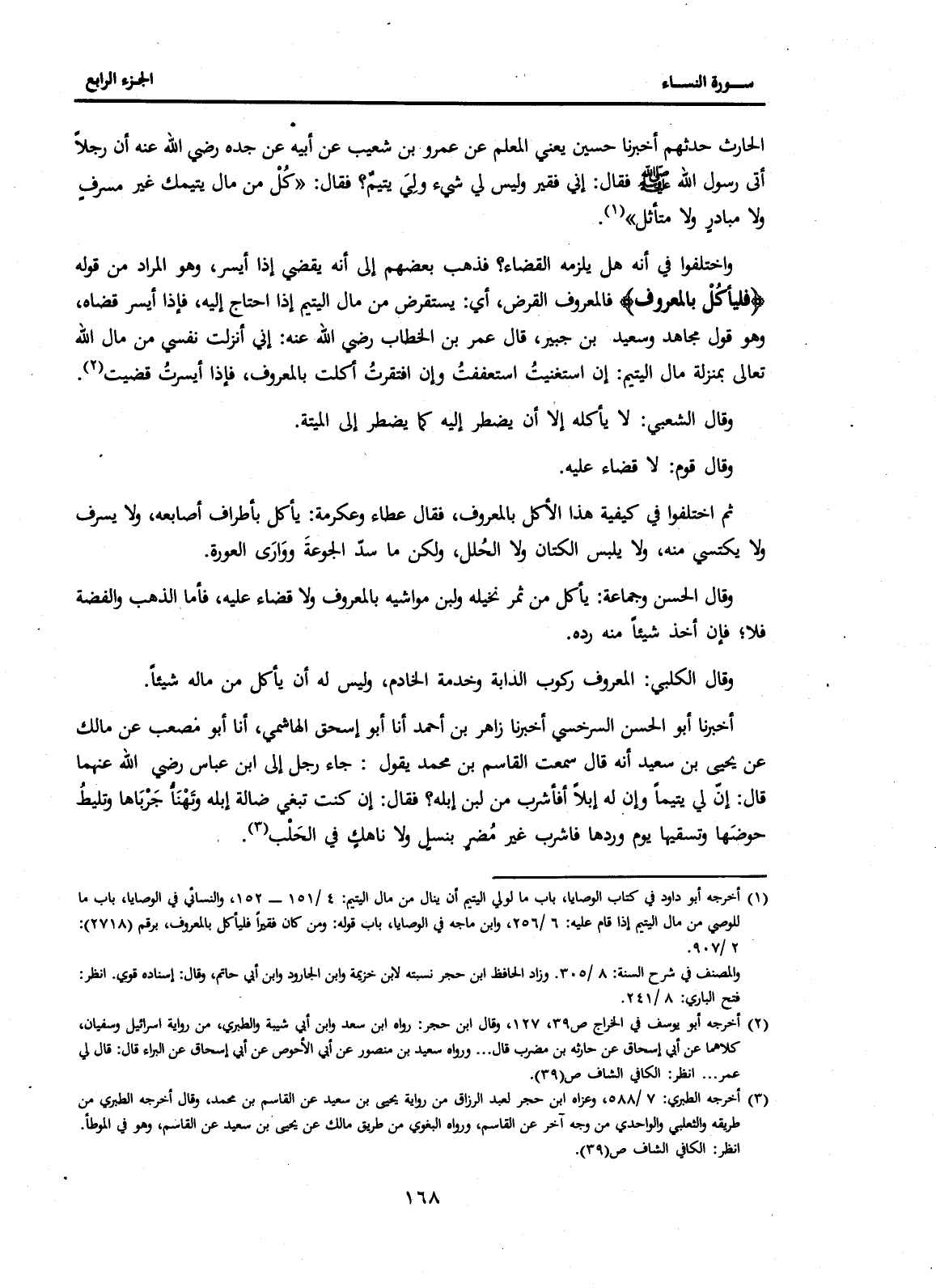 أَخْبَرَنَا أَبُو الْحَسَنِ السَّرَخْسِيُّ، أَخْبَرَنَا زَاهِرُ بْنُ أَحْمَدَ، أَنَا أَبُو إِسْحَاقَ الْهَاشِمِيُّ، أَنَا أَبُو مُصْعَبٍ، عَنْ مَالِكٍ، عَنْ يَحْيَى بْنِ سَعِيدٍ، أَنَّهُ قَالَ سَمِعْتُ الْقَاسِمَ بْنَ مُحَمَّدٍ يَقُولُ: جَاءَ رَجُلٌ إِلَى ابْنِ عَبَّاسٍ رَضِيَ اللَّهُ عَنْهُمَا قَالَ: إِنَّ لِي يَتِيمًا وَإِنَّ لَهُ إِبِلًا أَفَأَشْرَبُ مِنْ لَبَنِ إِبِلِهِ؟ فَقَالَ: إِنْ كُنْتَ تَبْغِي ضَالَّةَ إِبِلِهِ وَتَهْنَأُ جَرْبَاهَا وَتَلِيطُ حَوْضَهَا وَتَسْقِيهَا يَوْمَ وِرْدَهَا فَاشْرَبْ غَيْرَ مُضِرٍّ بِنَسْلٍ وَلَا نَاهِكٍ فِي الْحَلْبِ (3) .