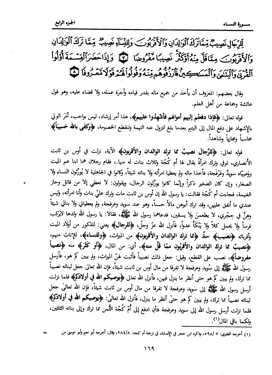 قَوْلُهُ تَعَالَى: {لِلرِّجَالِ نَصِيبٌ مِمَّا تَرَكَ الْوَالِدَانِ وَالْأَقْرَبُونَ} الْآيَةَ، نَزَلَتْ فِي أَوْسِ بْنِ ثَابِتٍ الْأَنْصَارِيِّ، تُوُفِّيَ وَتَرَكَ امْرَأَةً يُقَالُ لَهَا أُمُّ كُجَّةَ وَثَلَاثَ بَنَاتٍ لَهُ مِنْهَا. فَقَامَ رَجُلَانِ هُمَا ابْنَا عَمِّ الْمَيِّتِ وَوَصِيَّاهُ سُوَيْدٌ وَعَرْفَجَةُ، فَأَخْذَا مَالَهُ وَلَمْ يُعْطِيَا امْرَأَتَهُ وَلَا بَنَاتِهِ شَيْئًا، وَكَانُوا فِي الْجَاهِلِيَّةِ لَا يُوَرِّثُونَ النِّسَاءَ وَلَا الصِّغَارَ، وَإِنْ كَانَ الصَّغِيرُ ذَكَرًا وَإِنَّمَا كَانُوا يُوَرِّثُونَ الرِّجَالَ، وَيَقُولُونَ: لَا نُعْطِي إِلَّا مَنْ قَاتَلَ وَحَازَ الْغَنِيمَةَ، فَجَاءَتْ أُمُّ كُجَّةَ فَقَالَتْ: يَا رَسُولَ اللَّهِ إِنَّ أَوْسَ بْنَ ثَابِتٍ مَاتَ وَتَرَكَ عَلَيَّ بَنَاتٍ وَأَنَا امْرَأَتُهُ، وَلَيْسَ عِنْدِي مَا أُنْفِقُ عَلَيْهِنَّ، وَقَدْ تَرَكَ أَبُوهُنَّ مَالًا حَسَنًا، وَهُوَ عِنْدَ سُوَيْدٍ وَعَرْفَجَةَ، وَلَمْ يُعْطِيَانِي وَلَا بَنَاتِي شَيْئًا وَهُنَّ فِي حِجْرِي، لَا يُطْعَمْنَ وَلَا يُسْقَيْنَ، فَدَعَاهُمَا رَسُولُ اللَّهِ صَلَّى اللَّهُ عَلَيْهِ وَسَلَّمَ فَقَالَا يَا رَسُولَ اللَّهِ وَلَدَهَا لَا يَرَكَبُ فَرَسًا وَلَا يَحْمِلُ كَلًّا وَلَا يَنْكَأُ عَدُوًّا، فَأَنْزَلَ اللَّهُ عَزَّ وَجَلَّ، {لِلرِّجَالِ} يَعْنِي: لِلذُّكُورِ مِنْ أَوْلَادِ الْمَيِّتِ وَأَقْرِبَائِهِ {نَصِيبٌ} حَظٌّ {مِمَّا تَرَكَ الْوَالِدَانِ وَالْأَقْرَبُونَ} مِنَ الْمِيرَاثِ، {وَلِلنِّسَاءِ} لِلْإِنَاثِ مِنْهُمْ، {نَصِيبٌ مِمَّا تَرَكَ الْوَالِدَانِ وَالْأَقْرَبُونَ مِمَّا قَلَّ مِنْهُ} أَيْ: مِنَ الْمَالِ، {أَوْ كَثُرَ} مِنْهُ {نَصِيبًا مَفْرُوضًا} نُصِبَ عَلَى الْقَطْعِ، وَقِيلَ: جَعَلَ ذَلِكَ نَصِيبًا فَأَثْبَتَ لَهُنَّ الْمِيرَاثَ، وَلَمْ يُبَيِّنْ كَمْ هُوَ، فَأَرْسَلَ رَسُولُ اللَّهِ صَلَّى اللَّهُ عَلَيْهِ وَسَلَّمَ إِلَى سُوَيْدٍ وَعَرْفَجَةَ لَا تُفَرِّقَا مِنْ مَالِ أَوْسِ بْنِ ثَابِتٍ شَيْئًا، فَإِنَّ اللَّهَ تَعَالَى جَعْلَ لِبَنَاتِهِ نَصِيبًا مِمَّا تَرَكَ، وَلَمْ يُبَيِّنْ كَمْ هُوَ حَتَّى أَنْظُرَ مَا يَنْزِلُ فِيهِنَّ، فَأَنْزَلَ اللَّهُ تَعَالَى {يُوصِيكُمُ اللَّهُ فِي أَوْلَادِكُمْ} فِلْمَا نَزَلَتْ أَرْسَلَ رَسُولُ اللَّهِ صَلَّى اللَّهُ عَلَيْهِ وَسَلَّمَ إِلَى سُوِيدٍ وَعَرْفَجَةَ "أَنِ ادْفَعْ إِلَى أُمِّ كُجَّةَ الثُّمن مما رك وَإِلَى بَنَاتِهِ الثُّلُثَيْنِ، وَلَكُمَا بَاقِي الْمَالِ (1) .