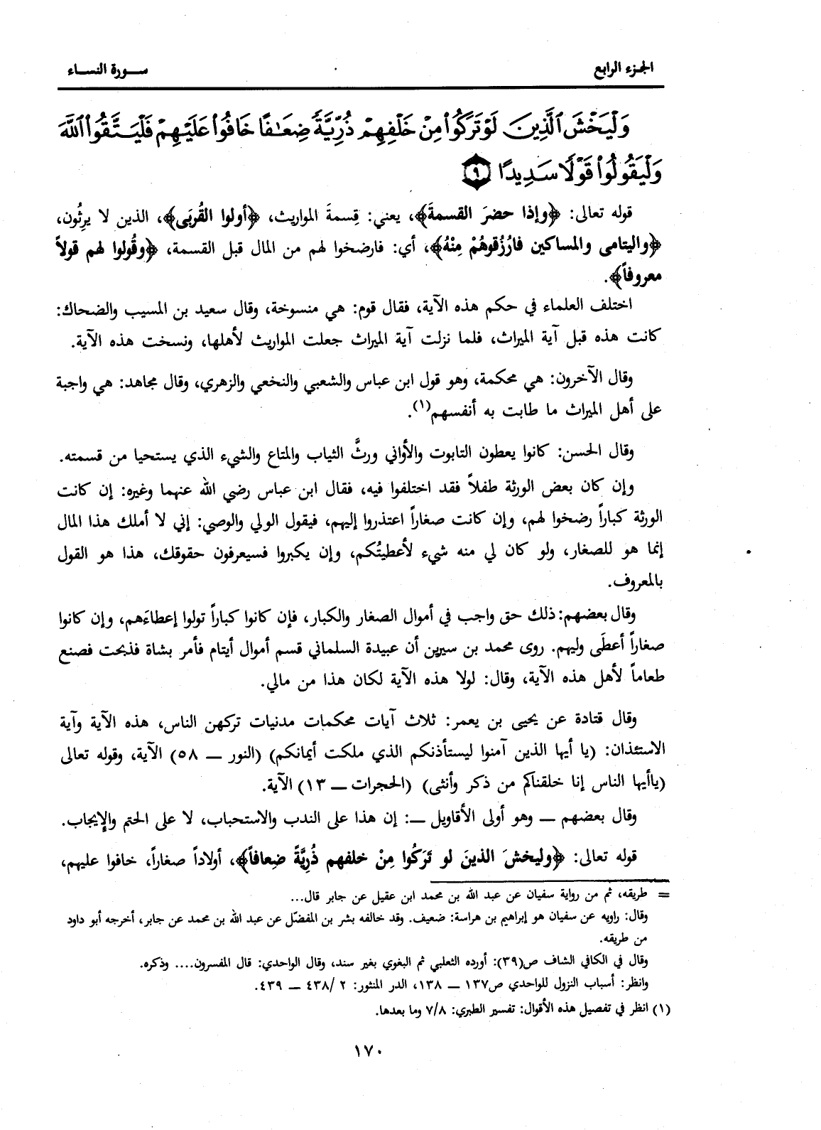 وَقَالَ الْآخَرُونَ: هِيَ مُحْكَمَةٌ، وَهُوَ قَوْلُ ابْنِ عَبَّاسٍ وَالشَّعْبِيِّ وَالنَّخَعِيِّ وَالزُّهْرِيِّ، وَقَالَ مُجَاهِدٌ: هِيَ وَاجِبَةٌ عَلَى أَهْلِ الْمِيرَاثِ مَا طَابَتْ بِهِ أَنْفُسُهُمْ (1) .