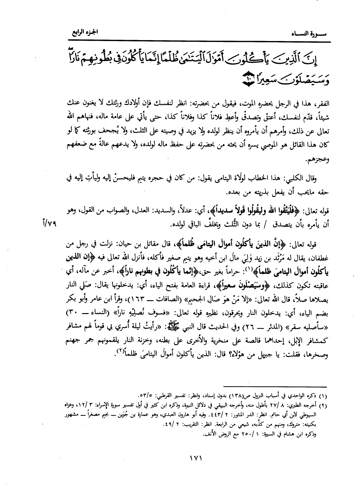 قَوْلُهُ تَعَالَى: {إِنَّ الَّذِينَ يَأْكُلُونَ أَمْوَالَ الْيَتَامَى ظُلْمًا} قَالَ مُقَاتِلُ بْنُ حَيَّانَ: نَزَلَتْ فِي رَجُلٍ مِنْ بَنِي غَطْفَانَ، يُقَالُ لَهُ مَرْثَدُ بْنُ زَيْدٍ وَلِيَ مَالَ ابْنِ أَخِيهِ وَهُوَ يَتِيمٌ صَغِيرٌ فَأَكَلَهُ، فَأَنْزَلَ اللَّهُ تَعَالَى فِيهِ {إِنَّ الَّذِينَ يَأْكُلُونَ أَمْوَالَ الْيَتَامَى ظُلْمًا} (1) حَرَامًا بِغَيْرِ حَقٍّ، {إِنَّمَا يَأْكُلُونَ فِي بُطُونِهِمْ نَارًا} أَخْبَرَ عَنْ مَآلِهِ، أَيْ عَاقِبَتُهُ تَكُونُ كَذَلِكَ، {وَسَيَصْلَوْنَ سَعِيرًا} قِرَاءَةُ الْعَامَّةِ بِفَتْحِ الْيَاءِ، أَيْ: يَدْخُلُونَهَا يُقَالُ: صَلِيَ النَّارَ يَصْلَاهَا صِلًا قَالَ اللَّهُ تَعَالَى: "إِلَّا من هو صَالِ الْجَحِيمِ" (الصَّافَّاتِ -163) ، وَقَرَأَ ابْنُ عَامِرٍ وَأَبُو بَكْرٍ بِضَمِّ الْيَاءِ، أَيْ: يَدْخُلُونَ النَّارَ وَيُحْرَقُونَ، نَظِيرُهُ قَوْلُهُ تَعَالَى: "فَسَوْفَ نُصْلِيهِ نَارًا" (النِّسَاءِ -30) "سَأُصْلِيهِ سَقَرَ" (الْمُدَّثِّرِ -26) وَفِي الْحَدِيثِ قَالَ النَّبِيُّ صَلَّى اللَّهُ عَلَيْهِ وَسَلَّمَ: "رَأَيْتُ لَيْلَةَ أُسْرِيَ بِي قَوْمًا لَهُمْ مَشَافِرُ كَمَشَافِرِ الْإِبِلِ، إِحْدَاهُمَا قَالِصَةٌ عَلَى مِنْخَرَيْهِ وَالْأُخْرَى عَلَى بَطْنِهِ، وَخَزَنَةُ النَّارِ يُلَقِّمُونَهُمْ جَمْرَ جَهَنَّمَ وَصَخْرَهَا، فَقُلْتُ: يَا جِبْرِيلُ مَنْ هَؤُلَاءِ؟ قَالَ: الَّذِينَ يَأْكُلُونَ أَمْوَالَ الْيَتَامَى ظُلْمًا (2) .