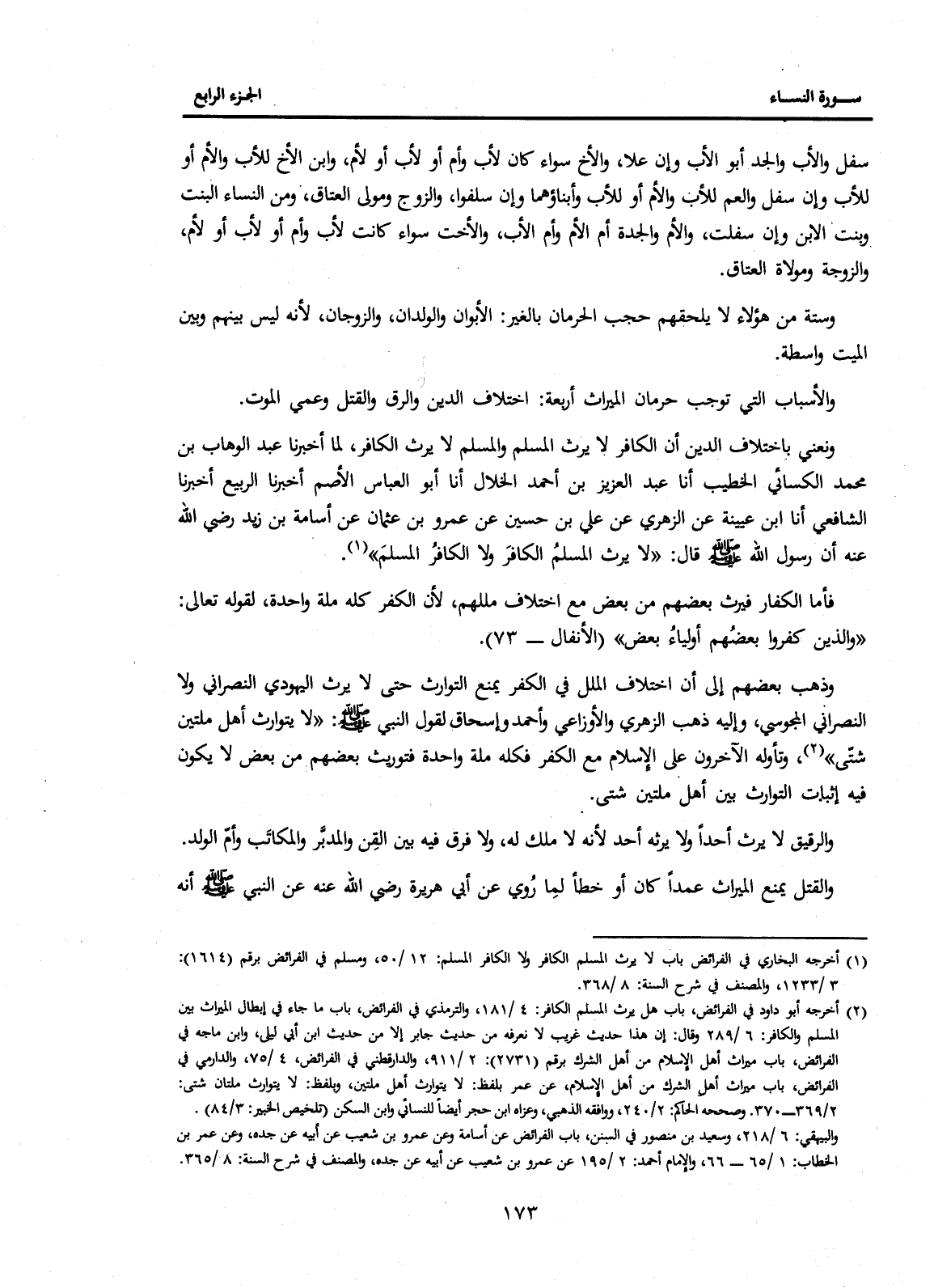 (2) أخرجه أبو داود في الفرائض، باب هل يرث المسلم الكافر: 4 / 181، والترمذي في الفرائض، باب ما جاء في إبطال الميراث بين المسلم والكافر: 6 / 289 وقال: إن هذا حديث غريب لا نعرفه من حديث جابر إلا من حديث ابن أبي ليلى، وابن ماجه في الفرائض، باب ميراث أهل الإسلام من أهل الشرك برقم (2731) : 2 / 911، والدارقطني في الفرائض، 4 / 75، والدارمي في الفرائض، باب ميراث أهل الشرك من أهل الإسلام، عن عمر بلفظ: لا يتوارث أهل ملتين، وبلفظ: لا يتوارث ملتان شتى: 2 / 369 - 370. وصححه الحاكم: 2 / 240، ووافقه الذهبي، وعزاه ابن حجر أيضا للنسائي وابن السكن (تلخيص الحبير: 3 / 84) . والبيهقي: 6 / 218، وسعيد بن منصور في السنن، باب الفرائض عن أسامة وعن عمرو بن شعيب عن أبيه عن جده، وعن عمر بن الخطاب: 1 / 65 - 66، والإمام أحمد: 2 / 195 عن عمرو بن شعيب عن أبيه عن جده، والمصنف في شرح السنة: 8 / 365.