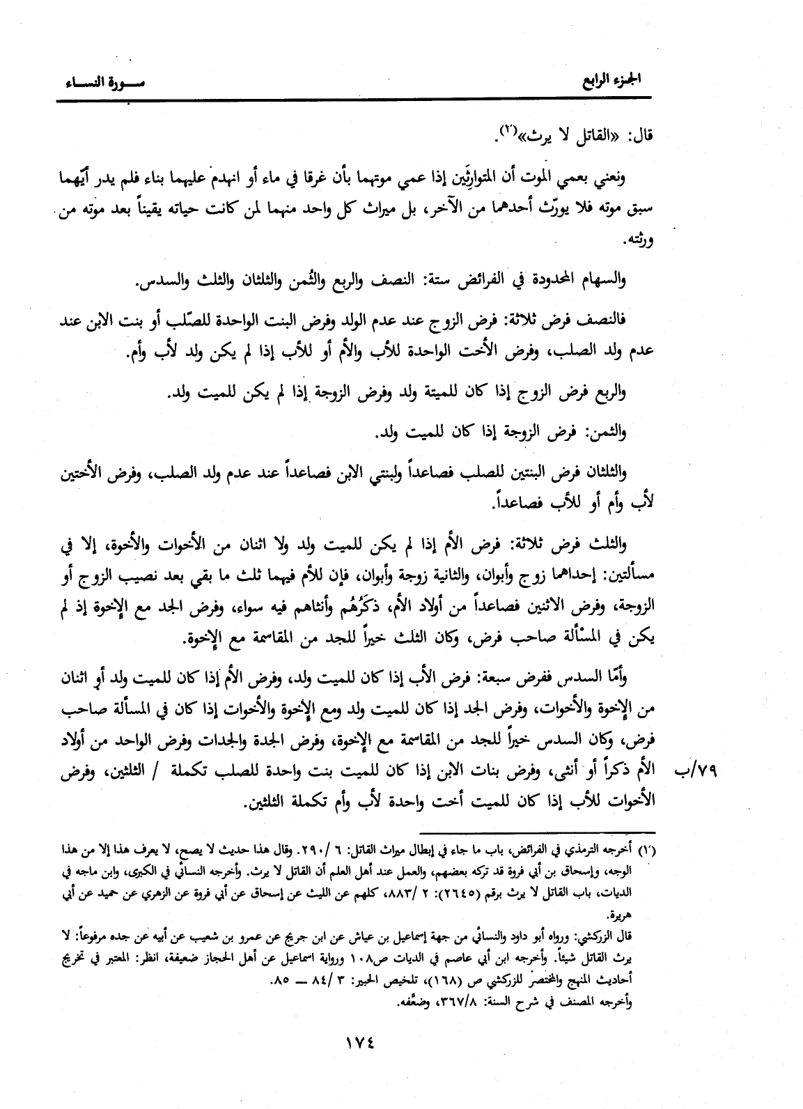 وَأَمَّا السُّدُسُ فَفَرْضُ سَبْعَةٍ: فَرْضُ الْأَبِ إِذَا كَانَ لِلْمَيِّتِ وَلَدٌ، وَفَرْضُ الْأُمِّ إِذَا كَانَ لِلْمَيِّتِ وَلَدٌ أَوِ اثْنَانِ مِنَ الْإِخْوَةِ وَالْأَخَوَاتِ، وَفَرْضُ الْجَدِّ إِذَا كَانَ لِلْمَيِّتِ وَلَدٌ وَمَعَ الْإِخْوَةِ وَالْأَخَوَاتِ إِذَا كَانَ فِي الْمَسْأَلَةِ صَاحِبُ فَرْضٍ، وَكَانَ السُّدُسُ خَيْرًا لِلْجَدِّ مِنَ الْمُقَاسَمَةِ مَعَ الْإِخْوَةِ، وَفَرْضُ الْجَدَّةِ وَالْجَدَّاتِ وَفَرْضُ الْوَاحِدِ مِنْ أَوْلَادِ الْأُمِّ ذَكَرًا أَوْ أُنْثَى، وَفَرْضُ بَنَاتِ الِابْنِ إِذَا كَانَ لِلْمَيِّتِ بِنْتٌ وَاحِدَةٌ للصلب تكملة 79/ب الثُّلُثَيْنِ، وَفَرْضُ الْأَخَوَاتِ لِلْأَبِ إِذَا كَانَ لِلْمَيِّتِ أُخْتٌ وَاحِدَةٌ لِأَبٍ وَأُمٍّ تَكْمِلَةُ الثُّلُثَيْنِ.