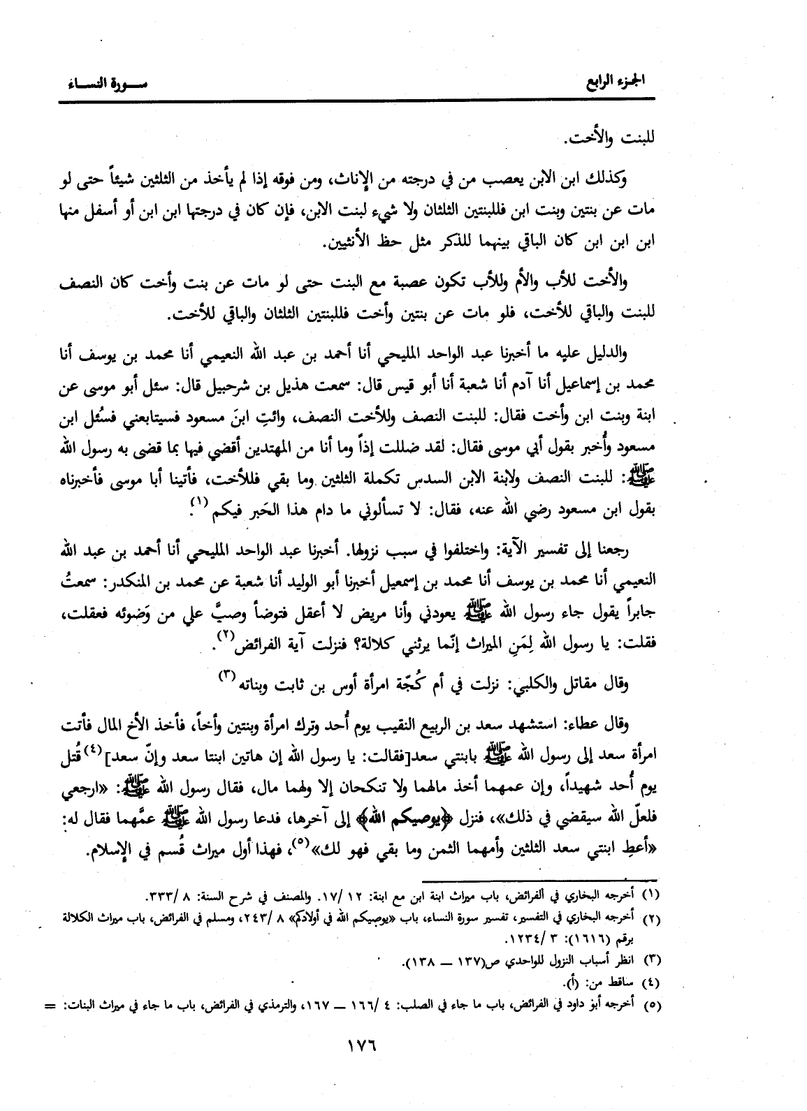 رَجَعْنَا إِلَى تَفْسِيرِ الْآيَةِ: وَاخْتَلَفُوا فِي سَبَبِ نُزُولِهَا. أَخْبَرَنَا عَبْدُ الْوَاحِدِ الْمُلَيْحِيُّ، أَنَا أَحْمَدُ بْنُ عَبْدِ اللَّهِ النُّعَيْمِيُّ، أَنَا مُحَمَّدُ بْنُ يُوسُفَ، أَنَا مُحَمَّدُ بْنُ إِسْمَاعِيلَ، أَخْبَرَنَا أَبُو الْوَلِيدِ، أَنَا شُعْبَةُ عَنْ مُحَمَّدِ بْنِ الْمُنْكَدِرِ: سَمِعْتُ جَابِرًا يَقُولُ جَاءَ رَسُولُ اللَّهِ صَلَّى اللَّهُ عَلَيْهِ وَسَلَّمَ يَعُودُنِي وَأَنَا مَرِيضٌ لَا أَعْقِلُ فَتَوَضَّأَ وَصَبَّ عَلَيَّ مِنْ وَضُوئِهِ فَعَقَلَتُ، فَقُلْتُ: يَا رَسُولَ اللَّهِ لِمَنِ الْمِيرَاثُ إِنَّمَا يَرِثُنِي كَلَالَةً؟ فَنَزَلَتْ آيَةُ الْفَرَائِضِ (2) .
