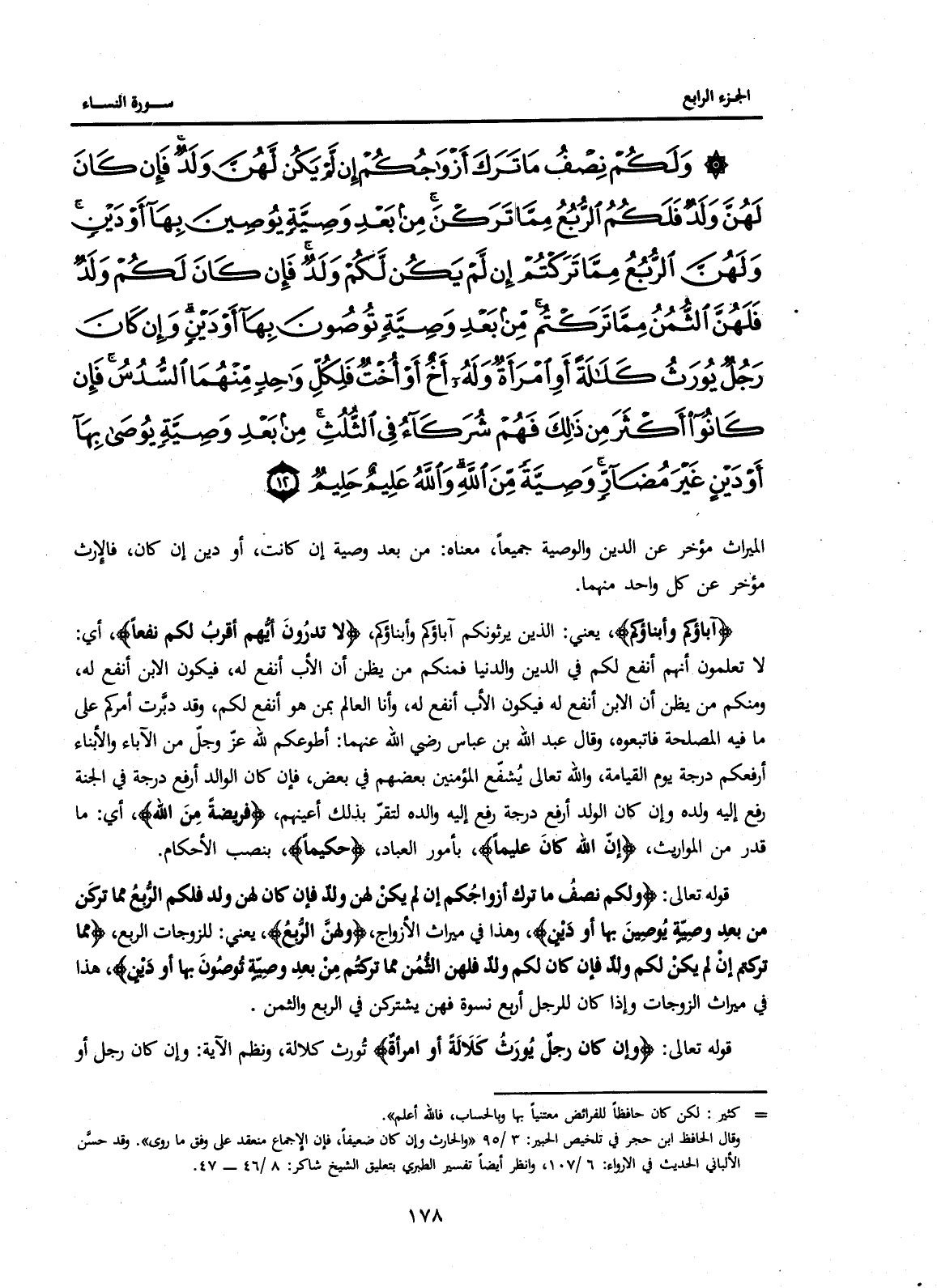 قَوْلُهُ تَعَالَى: {وَلَكُمْ نِصْفُ مَا تَرَكَ أَزْوَاجُكُمْ إِنْ لَمْ يَكُنْ لَهُنَّ وَلَدٌ فَإِنْ كَانَ لَهُنَّ وَلَدٌ فَلَكُمُ الرُّبُعُ مِمَّا تَرَكْنَ مِنْ بَعْدِ وَصِيَّةٍ يُوصِينَ بِهَا أَوْ دَيْنٍ} وَهَذَا فِي مِيرَاثِ الْأَزْوَاجِ، {وَلَهُنَّ الرُّبُعُ} يَعْنِي: لِلزَّوْجَاتِ الرُّبُعُ، {مِمَّا تَرَكْتُمْ إِنْ لَمْ يَكُنْ لَكُمْ وَلَدٌ فَإِنْ كَانَ لَكُمْ وَلَدٌ فَلَهُنَّ الثُّمُنُ مِمَّا تَرَكْتُمْ مِنْ بَعْدِ وَصِيَّةٍ تُوصُونَ بِهَا أَوْ دَيْنٍ} هَذَا فِي مِيرَاثِ الزَّوْجَاتِ وَإِذَا كَانَ لِلرَّجُلِ أَرْبَعُ نِسْوَةٍ فَهُنَّ يَشْتَرِكْنَ فِي الرُّبُعِ وَالثُّمُنِ.