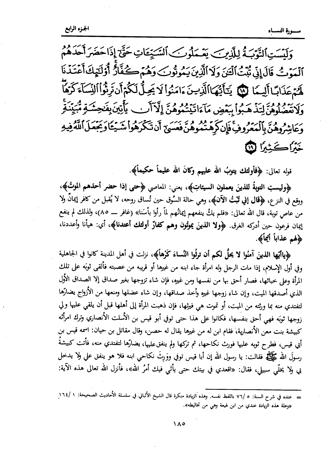 {وَلَيْسَتِ التَّوْبَةُ لِلَّذِينَ يَعْمَلُونَ السَّيِّئَاتِ حَتَّى إِذَا حَضَرَ أَحَدَهُمُ الْمَوْتُ قَالَ إِنِّي تُبْتُ الْآنَ وَلَا الَّذِينَ يَمُوتُونَ وَهُمْ كُفَّارٌ أُولَئِكَ أَعْتَدْنَا لَهُمْ عَذَابًا أَلِيمًا (18) يَا أَيُّهَا الَّذِينَ آمَنُوا لَا يَحِلُّ لَكُمْ أَنْ تَرِثُوا النِّسَاءَ كَرْهًا وَلَا تَعْضُلُوهُنَّ لِتَذْهَبُوا بِبَعْضِ مَا آتَيْتُمُوهُنَّ إِلَّا أَنْ يَأْتِينَ بِفَاحِشَةٍ مُبَيِّنَةٍ وَعَاشِرُوهُنَّ بِالْمَعْرُوفِ فَإِنْ كَرِهْتُمُوهُنَّ فَعَسَى أَنْ تَكْرَهُوا شَيْئًا وَيَجْعَلَ اللَّهُ فِيهِ خَيْرًا كَثِيرًا (19) }