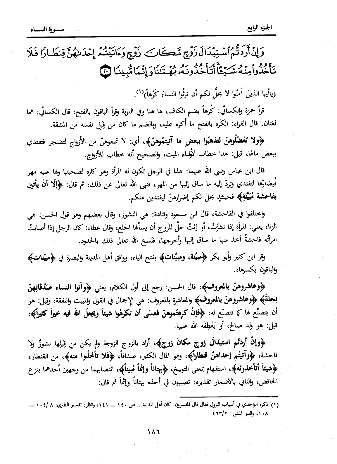 {وَإِنْ أَرَدتُّمُ اسْتِبْدَالَ زَوْجٍ مَكَانَ زَوْجٍ} أَرَادَ بِالزَّوْجِ الزَّوْجَةَ وَلَمْ يَكُنْ مِنْ قِبَلِهَا نُشُوزٌ وَلَا فَاحِشَةٌ، {وَآتَيْتُمْ إِحْدَاهُنَّ قِنْطَارًا} وَهُوَ الْمَالُ الْكَثِيرُ، صَدَاقًا، {فَلَا تَأْخُذُوا مِنْهُ} مِنَ الْقِنْطَارِ، {شَيْئًا أَتَأْخُذُونَهُ} اسْتِفْهَامٌ بِمَعْنَى التَّوْبِيخِ، {بُهْتَانًا وَإِثْمًا مُبِينًا} انْتِصَابُهُمَا مِنْ وَجْهَيْنِ أَحَدُهُمَا بِنَزْعِ الْخَافِضِ، وَالثَّانِي بِالْإِضْمَارِ تَقْدِيرُهُ: تُصِيبُونَ فِي أَخْذِهِ بُهْتَانًا وَإِثْمًا ثُمَّ قَالَ: {وَكَيْفَ تَأْخُذُونَهُ}