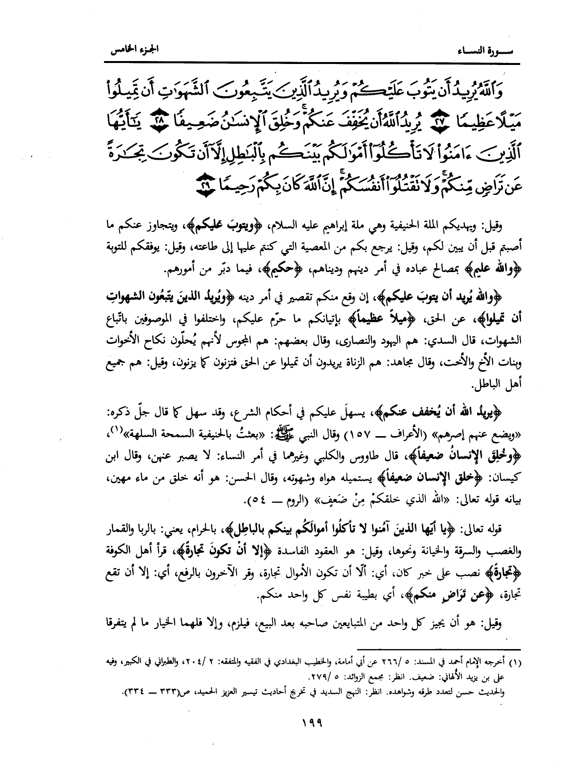{وَاللَّهُ يُرِيدُ أَنْ يَتُوبَ عَلَيْكُمْ وَيُرِيدُ الَّذِينَ يَتَّبِعُونَ الشَّهَوَاتِ أَنْ تَمِيلُوا مَيْلًا عَظِيمًا (27) يُرِيدُ اللَّهُ أَنْ يُخَفِّفَ عَنْكُمْ وَخُلِقَ الْإِنْسَانُ ضَعِيفًا (28) يَا أَيُّهَا الَّذِينَ آمَنُوا لَا تَأْكُلُوا أَمْوَالَكُمْ بَيْنَكُمْ بِالْبَاطِلِ إِلَّا أَنْ تَكُونَ تِجَارَةً عَنْ تَرَاضٍ مِنْكُمْ وَلَا تَقْتُلُوا أَنْفُسَكُمْ إِنَّ اللَّهَ كَانَ بِكُمْ رَحِيمًا (29) }