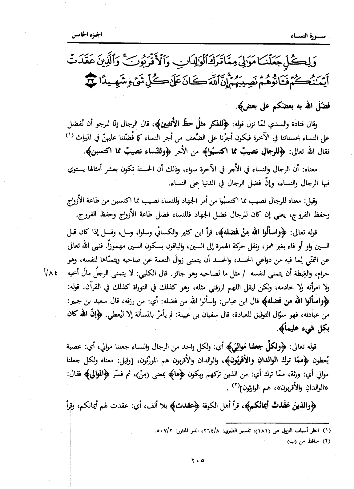 {وَلِكُلٍّ جَعَلْنَا مَوَالِيَ مِمَّا تَرَكَ الْوَالِدَانِ وَالْأَقْرَبُونَ وَالَّذِينَ عَقَدَتْ أَيْمَانُكُمْ فَآتُوهُمْ نَصِيبَهُمْ إِنَّ اللَّهَ كَانَ عَلَى كُلِّ شَيْءٍ شَهِيدًا (33) }