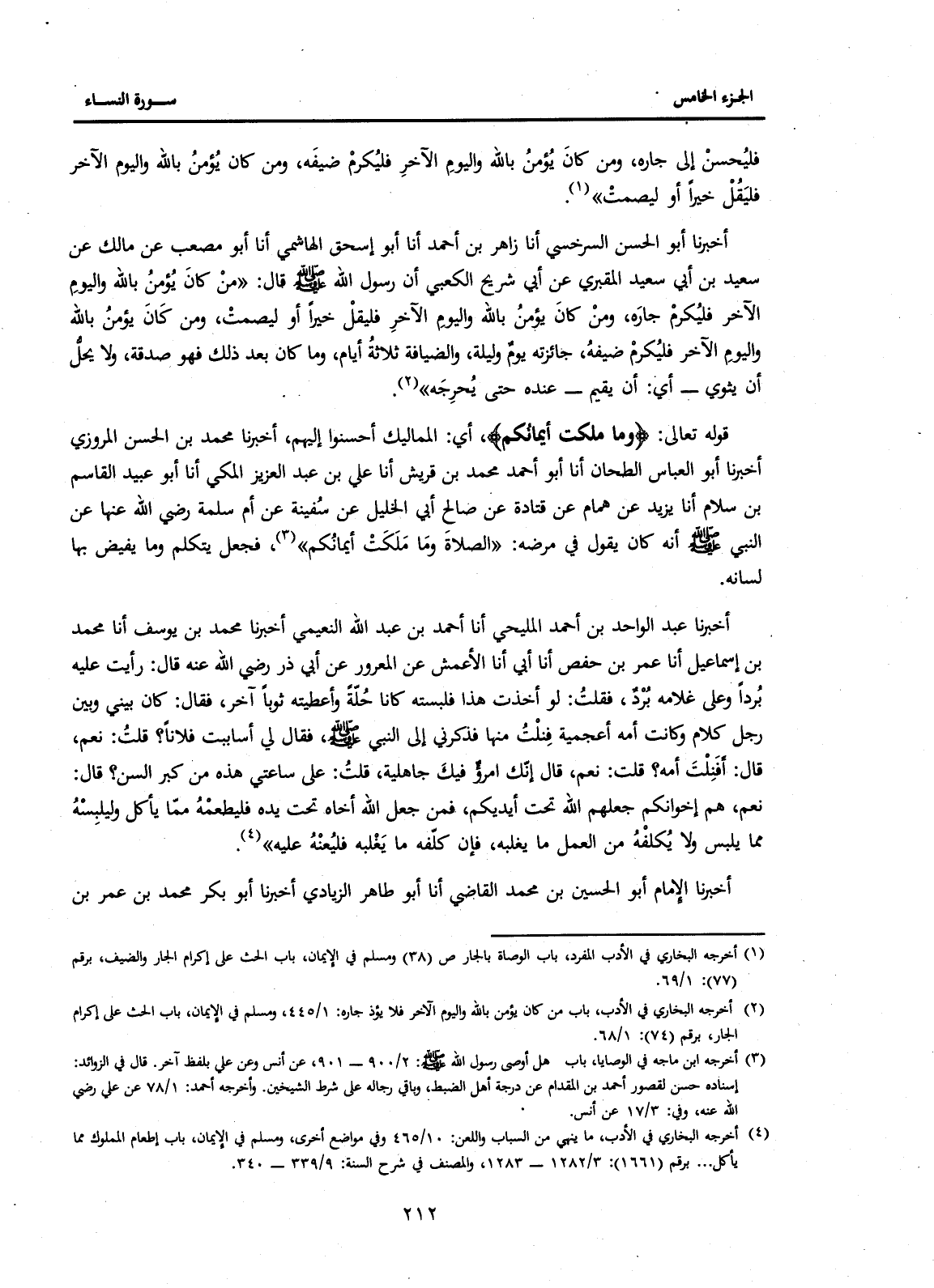 قَوْلُهُ تَعَالَى: {وَمَا مَلَكَتْ أَيْمَانُكُمْ} أَيْ: الْمَمَالِيكُ أَحْسِنُوا إِلَيْهِمْ، أَخْبَرَنَا مُحَمَّدُ بْنُ الْحَسَنِ الْمَرْوَزِيُّ أَخْبَرَنَا أَبُو الْعَبَّاسِ الطَّحَّانُ، أَنَا أَبُو أَحْمَدَ مُحَمَّدُ بْنُ قُرَيْشٍ، أَنَا عَلِيُّ بْنُ عَبْدِ الْعَزِيزِ الْمَكِّيُّ أَنَا أَبُو عَبِيدٍ الْقَاسِمُ بْنُ سَلَامٍ، أَنَا يَزِيدُ، عَنْ هَمَّامٍ، عَنْ قَتَادَةُ، عَنْ صَالِحٍ أَبِي الْخَلِيلِ، عَنْ سَفِينَةَ، عَنْ أُمِّ سَلَمَةَ رَضِيَ اللَّهُ عَنْهَا عَنِ النَّبِيِّ صَلَّى اللَّهُ عَلَيْهِ وَسَلَّمَ أَنَّهُ كَانَ يَقُولُ فِي مَرَضِهِ: "الصَّلَاةَ وَمَا مَلَكَتْ أَيْمَانُكُمْ" (3) ، فَجَعَلَ يَتَكَلَّمُ وَمَا يَفِيضُ بِهَا لِسَانُهُ.