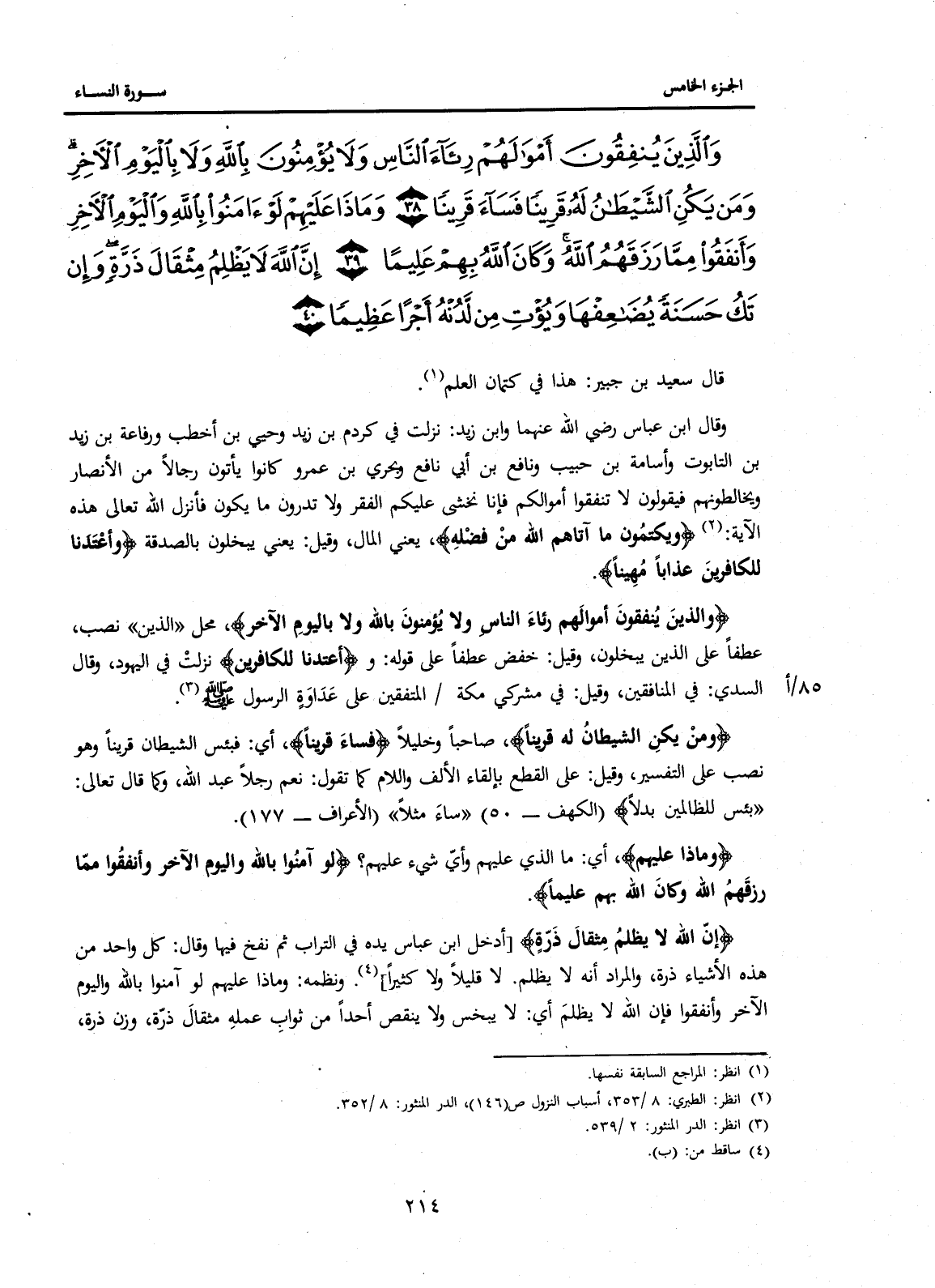 {وَالَّذِينَ يُنْفِقُونَ أَمْوَالَهُمْ رِئَاءَ النَّاسِ وَلَا يُؤْمِنُونَ بِاللَّهِ وَلَا بِالْيَوْمِ الْآخِرِ وَمَنْ يَكُنِ الشَّيْطَانُ لَهُ قَرِينًا فَسَاءَ قَرِينًا (38) وَمَاذَا عَلَيْهِمْ لَوْ آمَنُوا بِاللَّهِ وَالْيَوْمِ الْآخِرِ وَأَنْفَقُوا مِمَّا رَزَقَهُمُ اللَّهُ وَكَانَ اللَّهُ بِهِمْ عَلِيمًا (39) إِنَّ اللَّهَ لَا يَظْلِمُ مِثْقَالَ ذَرَّةٍ وَإِنْ تَكُ حَسَنَةً يُضَاعِفْهَا وَيُؤْتِ مِنْ لَدُنْهُ أَجْرًا عَظِيمًا (40) }