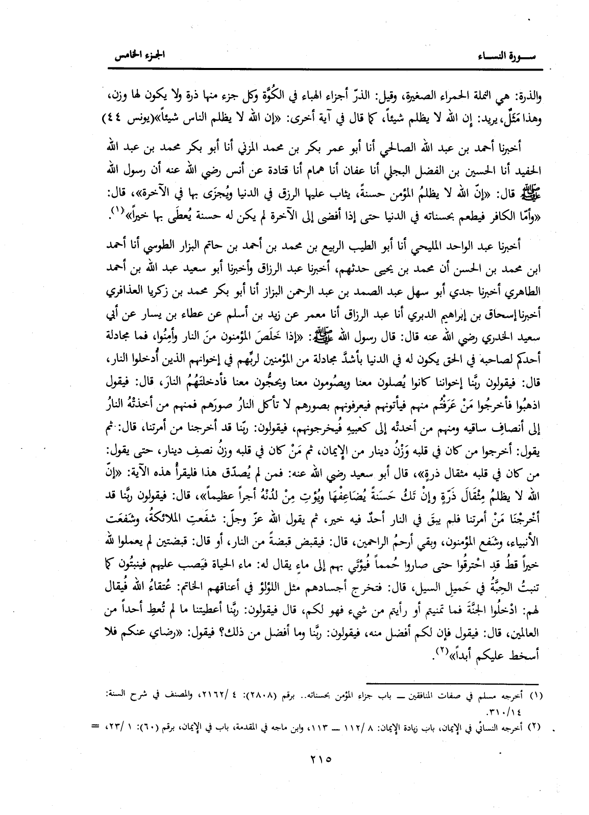 أَخْبَرَنَا عَبْدُ الْوَاحِدِ الْمُلَيْحِيُّ، أَنَا أَبُو الطِّيبِ الرَّبِيعُ بْنُ مُحَمَّدِ بْنِ أَحْمَدَ بْنِ حَاتِمٍ الْبَزَّارُ الطُّوسِيُّ، أَنَا أَحْمَدُ بْنُ مُحَمَّدِ بْنِ الْحَسَنِ، أَنْ مُحَمَّدَ بْنَ يَحْيَى حَدَّثَهُمْ، أَخْبَرَنَا عَبْدُ الرَّزَّاقِ وَأَخْبَرَنَا أَبُو سَعِيدٍ عَبْدُ اللَّهِ بْنُ أَحْمَدَ الطَّاهِرِيُّ، أَخْبَرَنَا جَدِّي أَبُو سَهْلٍ عَبْدُ الصَّمَدِ بْنُ عَبْدِ الرَّحْمَنِ الْبَزَّارُ، أَنَا أَبُو بَكْرٍ مُحَمَّدُ بْنُ زَكَرِيَّا الْعَذَافِرِيُّ، أَخْبَرَنَا إِسْحَاقُ بْنُ إِبْرَاهِيمَ الدَّبَرِيُّ أَنَا عَبْدُ الرَّزَّاقِ، أَنَا مَعْمَرٌ، عَنْ زَيْدِ بْنِ أَسْلَمَ عَنْ عَطَاءِ بْنِ يَسَارٍ عَنْ أَبِي سَعِيدٍ الْخُدْرِيِّ رَضِيَ اللَّهُ عَنْهُ قَالَ: قَالَ رَسُولُ اللَّهِ صَلَّى اللَّهُ عَلَيْهِ وَسَلَّمَ: "إِذَا خَلَصَ الْمُؤْمِنُونَ مِنَ النَّارِ وَأَمِنُوا، فَمَا مُجَادَلَةُ أَحَدِكُمْ لِصَاحِبِهِ فِي الْحَقِّ يَكُونُ لَهُ فِي الدُّنْيَا بِأَشَدَّ مُجَادَلَةً مِنَ الْمُؤْمِنِينَ لِرَبِّهِمْ فِي إِخْوَانِهِمُ الَّذِينَ أُدْخِلُو النَّارَ، قَالَ: يَقُولُونَ رَبَّنَا إِخْوَانَنَا كَانُوا يُصَلُّونَ مَعَنَا وَيَصُومُونَ مَعَنَا وَيَحُجُّونَ مَعَنَا فَأَدْخَلْتَهُمُ النَّارَ، قال: فيقول ذهبوا فَأَخْرِجُوا مَنْ عَرَفْتُمْ مِنْهُمْ فَيَأْتُونَهُمْ فَيَعْرِفُونَهُمْ بِصُوَرِهِمْ لَا تَأْكُلُ النَّارُ صُوَرَهُمْ فَمِنْهُمْ مَنْ أَخَذَتْهُ النَّارُ إِلَى أَنْصَافِ سَاقَيْهِ وَمِنْهُمْ مَنْ أَخَذَتْهُ إِلَى كَعْبَيْهِ فَيُخْرِجُونَهُمْ، فَيَقُولُونَ: رَبَّنَا قَدْ أَخْرَجْنَا مَنْ أَمَرْتَنَا، قَالَ: ثُمَّ يَقُولُ: أَخْرِجُوا مَنْ كَانَ فِي قَلْبِهِ وَزْنُ دِينَارٍ مِنَ الْإِيمَانِ، ثُمَّ مَنْ كَانَ فِي قَلْبِهِ وَزْنُ نِصْفِ دِينَارٍ، حَتَّى يَقُولَ: مَنْ كَانَ فِي قَلْبِهِ مِثْقَالَ ذَرَّةٍ"، قَالَ أَبُو سَعِيدٍ رَضِيَ اللَّهُ عَنْهُ: فَمَنْ لَمْ يُصَدِّقْ هَذَا فَلْيَقْرَأْ هَذِهِ الْآيَةَ: "إِنَّ اللَّهَ لَا يَظْلِمُ مِثْقَالَ ذَرَّةٍ وَإِنْ تَكُ حَسَنَةً يُضَاعِفْهَا وَيُؤْتِ مِنْ لَدُنْهُ أَجْرًا عَظِيمًا" قَالَ: فَيَقُولُونَ رَبَّنَا قَدْ أَخْرَجْنَا مَنْ أَمَرْتَنَا فَلَمْ يَبْقَ فِي النَّارِ أَحَدٌ فِيهِ خَيْرٌ، ثُمَّ يَقُولُ اللَّهُ عَزَّ وَجَلَّ: شَفَعَتِ الْمَلَائِكَةُ، وَشَفَعَتِ الْأَنْبِيَاءُ، وَشَفَعَ الْمُؤْمِنُونَ، وَبَقِيَ أَرْحَمُ الرَّاحِمِينَ، قَالَ: فَيَقْبِضُ قَبْضَةً مِنَ النَّارِ، أَوْ قَالَ: قَبْضَتَيْنِ لَمْ يَعْمَلُوا لِلَّهِ خَيْرًا قَطُّ قَدِ احْتَرَقُوا حَتَّى صَارُوا حُمَمًا فَيُؤْتَى بِهِمْ إِلَى مَاءٍ يُقَالُ لَهُ: مَاءُ الْحَيَاةِ فَيَصُبُّ عَلَيْهِمْ فَيَنْبُتُونَ كَمَا تَنْبُتُ الْحَبَّةُ فِي حَمِيلِ السَّيْلِ، قَالَ: فَتَخْرُجُ أَجْسَادُهُمْ مِثْلَ اللُّؤْلُؤِ فِي أَعْنَاقِهِمُ الْخَاتَمُ: عُتَقَاءُ اللَّهِ فَيُقَالُ لَهُمْ: ادْخُلُوا الْجَنَّةَ فَمَا تَمَنَّيْتُمْ أَوْ رَأَيْتُمْ مِنْ شَيْءٍ فَهُوَ لَكُمْ، قَالَ فَيَقُولُونَ: رَبَّنَا أَعْطَيْتَنَا مَا لَمْ تُعْطِ أَحَدًا مِنَ الْعَالَمِينَ، قَالَ: فَيَقُولُ فَإِنَّ لَكُمْ أَفْضَلَ مِنْهُ، فَيَقُولُونَ: رَبَّنَا وَمَا أَفْضَلُ مِنْ ذَلِكَ؟ فَيَقُولُ: "رِضَايَ عَنْكُمْ فَلَا أَسْخَطُ عَلَيْكُمْ أَبَدًا" (2) .