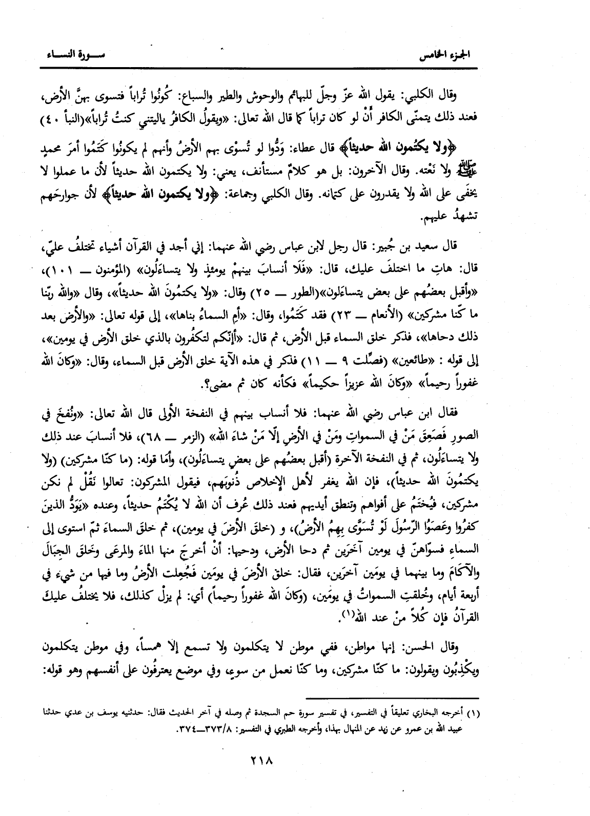 فَقَالَ ابْنُ عَبَّاسٍ رَضِيَ اللَّهُ عَنْهُمَا: فَلَا أَنْسَابَ بَيْنَهُمْ فِي النَّفْخَةِ الْأُولَى قَالَ اللَّهُ تَعَالَى: "وَنُفِخَ فِي الصُّورِ فَصَعِقَ مَنْ فِي السَّمَوَاتِ وَمَنْ فِي الْأَرْضِ إِلَّا مَنْ شَاءَ اللَّهُ" (الزُّمَرِ -68) ، فَلَا أَنْسَابَ عِنْدَ ذَلِكَ وَلَا يَتَسَاءَلُونَ، ثُمَّ فِي النَّفْخَةِ الْآخِرَةِ {أَقْبَلَ بَعْضُهُمْ عَلَى بَعْضٍ يَتَسَاءَلُونَ} ، وَأَمَّا قَوْلُهُ: {مَا كُنَّا مُشْرِكِينَ} {وَلَا يَكْتُمُونَ اللَّهَ حَدِيثًا} ، فَإِنَّ اللَّهَ يَغْفِرُ لِأَهْلِ الْإِخْلَاصِ ذُنُوبَهُمْ، فَيَقُولُ الْمُشْرِكُونَ: تَعَالَوْا نَقُلْ لَمْ نَكُنْ مُشْرِكِينَ، فَيُخْتَمُ عَلَى أَفْوَاهِهِمْ وَتَنْطِقُ أَيْدِيهِمْ فَعِنْدَ ذَلِكَ عُرِفَ أَنَّ اللَّهَ لَا يَكْتَمُ حَدِيثًا، وَعِنْدَهُ {يَوَدُّ الَّذِينَ كَفَرُوا وَعَصَوُا الرَّسُولَ لَوْ تُسَوَّى بِهِمُ الْأَرْضُ} ، و {خَلَقَ الْأَرْضَ فِي يَوْمَيْنِ} ، ثُمَّ خَلَقَ السَّمَاءَ ثُمَّ اسْتَوَى إِلَى السَّمَاءِ فَسَوَّاهُنَّ فِي يَوْمَيْنِ آخَرَيْنِ ثُمَّ دَحَا الْأَرْضَ، وَدَحْيهَا: أَنْ أَخْرَجَ مِنْهَا الْمَاءَ وَالْمَرْعَى وَخَلَقَ الْجِبَالَ وَالْآكَامَ وَمَا بَيْنَهُمَا فِي يَوْمَيْنِ آخَرَيْنِ، فَقَالَ:: خَلَقَ الْأَرْضَ فِي يَوْمَيْنِ فَجُعِلَتِ الْأَرْضُ وَمَا فِيهَا مِنْ شَيْءٍ فِي أَرْبَعَةِ أَيَّامٍ، وَخُلِقَتِ السَّمَوَاتُ فِي يَوْمَيْنِ، {وَكَانَ اللَّهُ غَفُورًا رَحِيمًا} أَيْ: لَمْ يَزَلْ كَذَلِكَ، فَلَا يَخْتَلِفُ عَلَيْكَ الْقُرْآنُ فَإِنَّ كُلًّا مِنْ عِنْدِ اللَّهِ (1) .