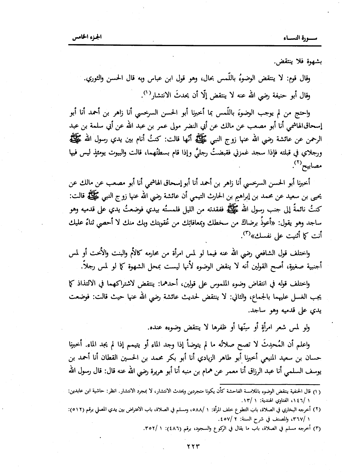 وَاحْتَجَّ مَنْ لَمْ يُوجِبِ الْوُضُوءَ بِاللَّمْسِ بِمَا أَخْبَرَنَا أَبُو الْحَسَنِ السَّرَخْسِيُّ، أَنَا زَاهِرُ بْنُ أَحْمَدَ، أَنَا أَبُو إِسْحَاقَ الْهَاشِمِيُّ، أَنَا أَبُو مُصْعَبٍ، عَنْ مَالِكٍ، عَنْ أَبِي النَّضِرِ مَوْلَى عُمَرَ بْنِ عَبْدِ اللَّهِ، عَنْ أَبِي سَلَمَةَ بْنِ عَبْدِ الرَّحْمَنِ، عَنْ عَائِشَةَ رَضِيَ اللَّهُ عَنْهَا زَوْجِ النَّبِيِّ صَلَّى اللَّهُ عَلَيْهِ وَسَلَّمَ أَنَّهَا قَالَتْ: كُنْتُ أَنَامُ بَيْنَ يَدَيْ رَسُولِ اللَّهِ صَلَّى اللَّهُ عَلَيْهِ وَسَلَّمَ وَرِجْلَايَ فِي قِبْلَتِهِ فَإِذَا سَجَدَ غَمَزَنِي فَقَبَضْتُ رَجِلِي وَإِذَا قَامَ بَسَطْتُهُمَا، قَالَتْ وَالْبُيُوتُ يَوْمئِذٍ لَيْسَ فِيهَا مَصَابِيحُ (2) .
