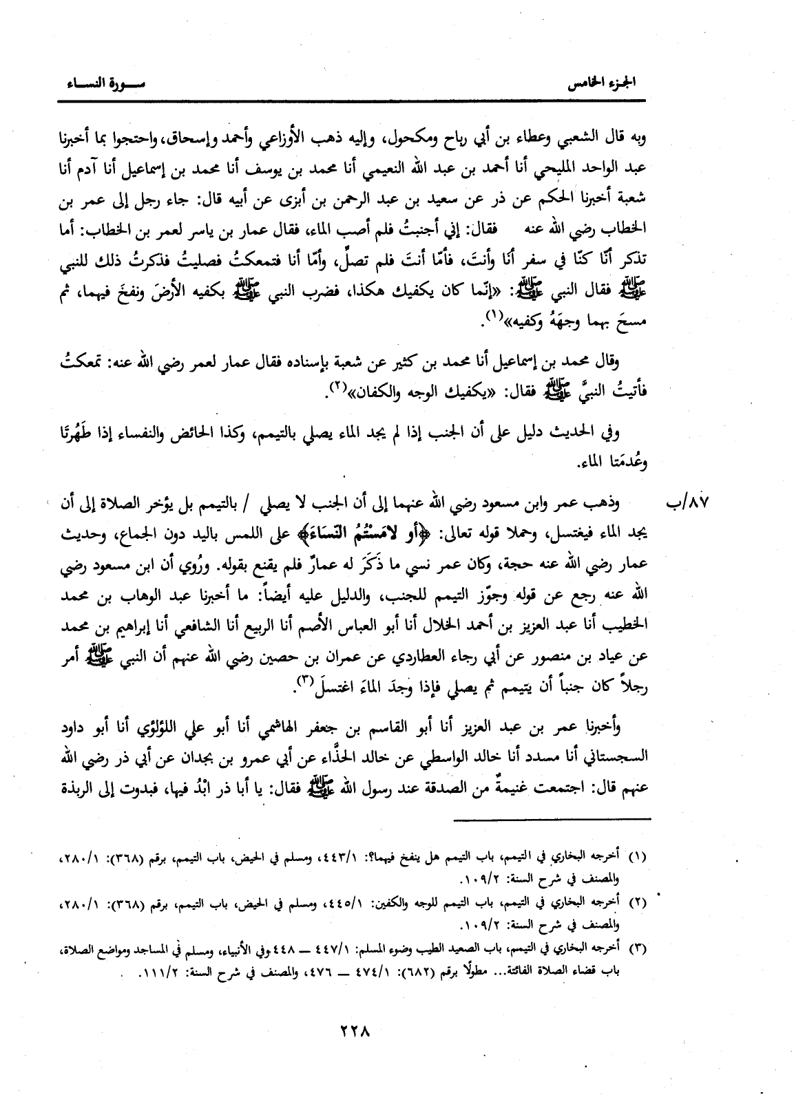 (1) أخرجه البخاري في التيمم، باب التيمم هل ينفخ فيهما؟ : 1 / 443، ومسلم في الحيض، باب التيمم، برقم (368) : 1 / 280، والمصنف في شرح السنة: 2 / 109.