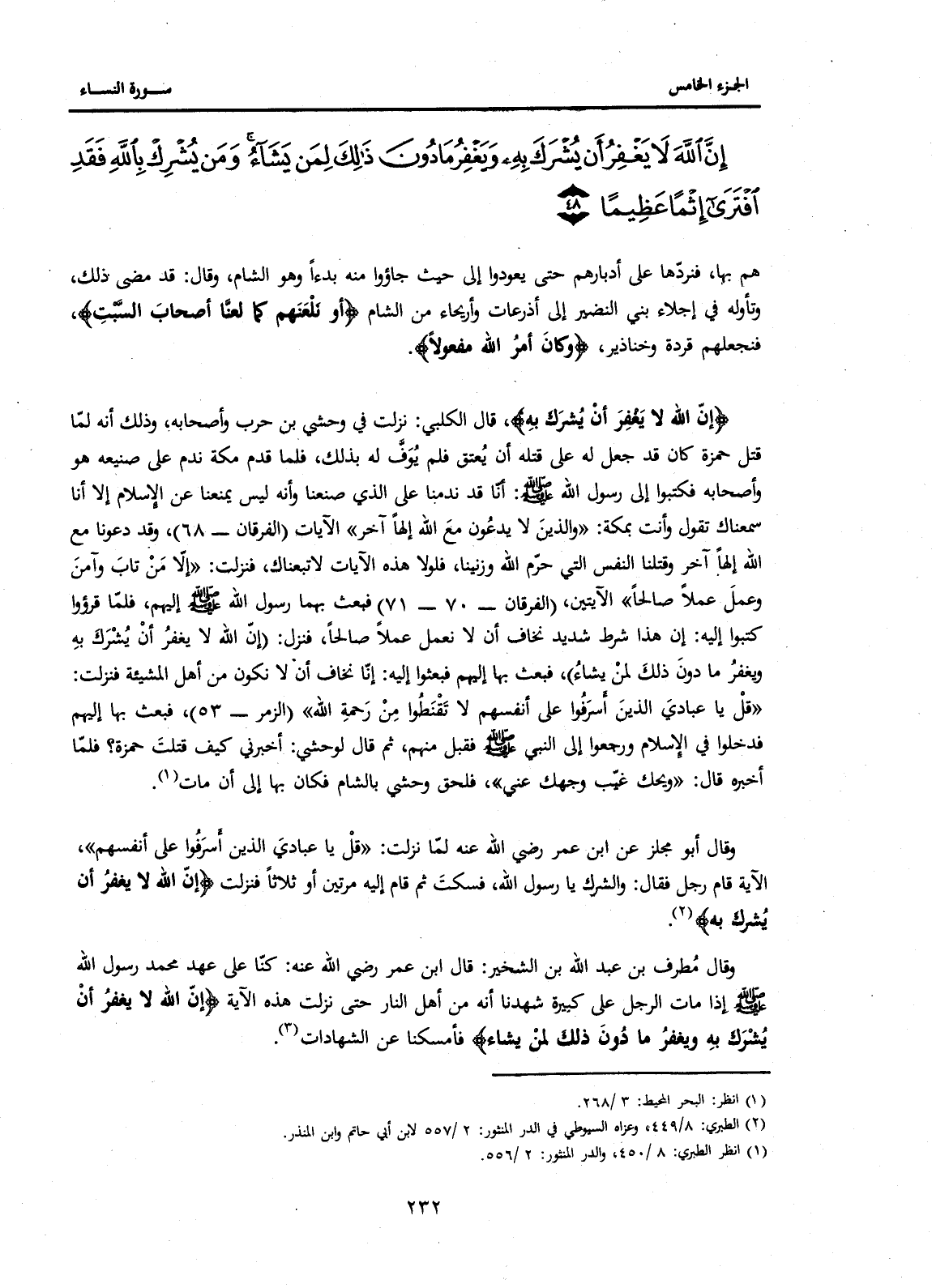 {إِنَّ اللَّهَ لَا يَغْفِرُ أَنْ يُشْرَكَ بِهِ} قَالَ الْكَلْبِيُّ: نَزَلَتْ فِي وَحْشِيِّ بْنِ حَرْبٍ وَأَصْحَابِهِ، وَذَلِكَ أَنَّهُ لَمَّا قَتَلَ حَمْزَةَ كَانَ قَدْ جُعِلَ لَهُ عَلَى قَتْلِهِ أَنْ يُعْتَقَ فَلَمْ يُوَفَّ لَهُ بِذَلِكَ، فَلَمَّا قَدِمَ مَكَّةَ نَدِمَ عَلَى صَنِيعِهِ هُوَ وَأَصْحَابُهُ فَكَتَبُوا إِلَى رَسُولِ اللَّهِ صَلَّى اللَّهُ عَلَيْهِ وَسَلَّمَ: أَنَّا قَدْ نَدِمْنَا عَلَى الَّذِي صَنَعْنَا وَأَنَّهُ لَيْسَ يَمْنَعُنَا عَنِ الْإِسْلَامِ إِلَّا أَنَّا سَمِعْنَاكَ تَقُولُ وَأَنْتَ بِمَكَّةَ: "وَالَّذِينَ لَا يَدْعُونَ مَعَ اللَّهِ إِلَهًا آخَرَ" الْآيَاتِ (الْفَرْقَانِ -68) ، وَقَدْ دَعَوْنَا مَعَ اللَّهِ إِلَهًا آخَرَ وَقَتَلْنَا النَّفْسَ الَّتِي حَرَّمَ اللَّهُ وَزَنَيْنَا، فَلَوْلَا هَذِهِ الْآيَاتُ لَاتَّبَعْنَاكَ، فَنَزَلَتْ: "إِلَّا مَنْ تَابَ وَآمَنَ وَعَمِلَ عَمَلًا صَالِحًا" الْآيَتَيْنِ، (الْفَرْقَانِ -70 -71) فَبَعَثَ بِهِمَا رَسُولُ اللَّهِ صَلَّى اللَّهُ عَلَيْهِ وَسَلَّمَ إِلَيْهِمْ، فَلَمَّا قَرَأُوا كَتَبُوا إِلَيْهِ: إِنَّ هَذَا شَرْطٌ شَدِيدٌ نَخَافُ أَنْ لَا نَعْمَلَ عَمَلًا صَالِحًا، فَنَزَلَ: {إِنَّ اللَّهَ لَا يَغْفِرُ أَنْ يُشْرَكَ بِهِ وَيَغْفِرُ مَا دُونَ ذَلِكَ لِمَنْ يَشَاءُ} ، فَبَعَثَ بِهَا إِلَيْهِمْ فَبَعَثُوا إِلَيْهِ: إِنَّا نَخَافُ أَنْ لَا نَكُونَ مِنْ أَهْلِ الْمَشِيئَةِ فَنَزَلَتْ: "قُلْ يَا عِبَادِيَ الَّذِينَ أَسْرَفُوا عَلَى أَنْفُسِهِمْ لَا تَقْنَطُوا مِنْ رَحْمَةِ اللَّهِ" (الزَّمْرِ -53) ، فَبَعَثَ بِهَا إِلَيْهِمْ فَدَخَلُوا فِي الْإِسْلَامِ وَرَجَعُوا إِلَى النَّبِيِّ صَلَّى اللَّهُ عَلَيْهِ وَسَلَّمَ فَقَبِلَ مِنْهُمْ، ثُمَّ قَالَ لِوَحْشِيٍّ: أَخْبَرْنِي كَيْفَ قَتَلْتَ حَمْزَةَ؟ فَلَمَّا أَخْبَرَهُ قَالَ: "وَيْحَكَ غَيِّبْ وَجْهَكَ عَنِّي"، فَلَحِقَ وَحْشَيٌّ بِالشَّامِ فَكَانَ بِهَا إِلَى أَنْ مَاتَ (1) .