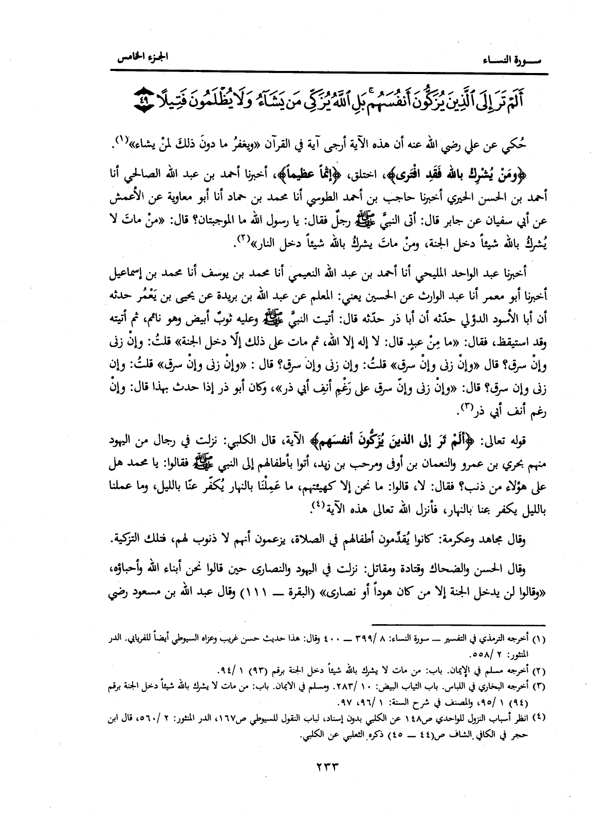 قَوْلُهُ تَعَالَى: {أَلَمْ تَرَ إِلَى الَّذِينَ يُزَكُّونَ أَنْفُسَهُمْ} الْآيَةَ، قَالَ الْكَلْبِيُّ: نَزَلَتْ فِي رِجَالٍ مِنَ الْيَهُودِ مِنْهُمْ بَحْرِيُّ بْنُ عَمْرٍو وَالنُّعْمَانُ بْنُ أَوْفَى وَمَرْحَبُ بْنُ زَيْدٍ، أَتَوْا بِأَطْفَالِهِمْ إِلَى النَّبِيِّ صَلَّى اللَّهُ عَلَيْهِ وَسَلَّمَ فَقَالُوا: يَا مُحَمَّدُ هَلْ عَلَى هَؤُلَاءِ مِنْ ذَنْبٍ؟ فَقَالَ: لَا قَالُوا: مَا نَحْنُ إِلَّا كَهَيْئَتِهِمْ، مَا عَمِلْنَا بِالنَّهَارِ يُكَفَّرُ عَنَّا بِاللَّيْلِ، وَمَا عَمِلْنَا بِاللَّيْلِ يُكَفَّرُ عَنَّا بِالنَّهَارِ، فَأَنْزَلَ اللَّهُ تَعَالَى هَذِهِ الْآيَةَ. (4) .
