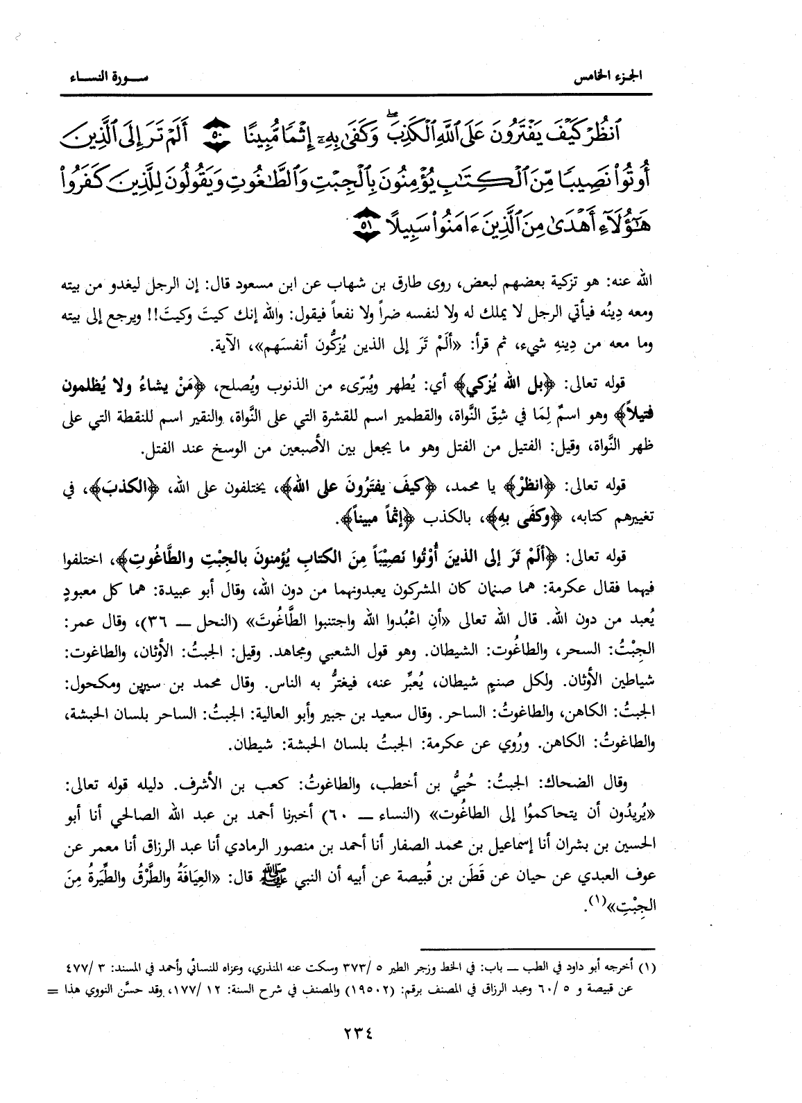 وَقَالَ الضَّحَّاكُ: الْجِبْتُ: حُيَيُّ بْنُ أَخْطَبَ، وَالطَّاغُوتُ: كَعْبُ بْنُ الْأَشْرَفِ. دَلِيلُهُ قَوْلُهُ تَعَالَى: "يُرِيدُونَ أَنْ يَتَحَاكَمُوا إِلَى الطَّاغُوتِ" (النِّسَاءِ -60) أَخْبَرَنَا أَحْمَدُ بْنُ عَبْدِ اللَّهِ الصَّالِحِيُّ أَنَا أَبُو الْحُسَيْنِ بْنُ بِشْرَانَ، أَنَا إِسْمَاعِيلُ بْنُ مُحَمَّدٍ الصَّفَّارُ، أَنَا أَحْمَدُ بْنُ مَنْصُورٍ الرَّمَادِيُّ، أَنَا عَبْدُ الرَّزَّاقِ أَنَا مَعْمَرٌ عَنْ عَوْفٍ الْعَبْدِيِّ عَنْ حَيَّانَ عَنْ قَطَنِ بْنِ قَبِيصَةَ عَنْ أَبِيهِ أَنَّ النَّبِيَّ صَلَّى اللَّهُ عَلَيْهِ وَسَلَّمَ قَالَ: "الْعِيَافَةُ وَالطَّرْقُ وَالطِّيرَةُ مِنَ الْجِبْتِ" (1) .