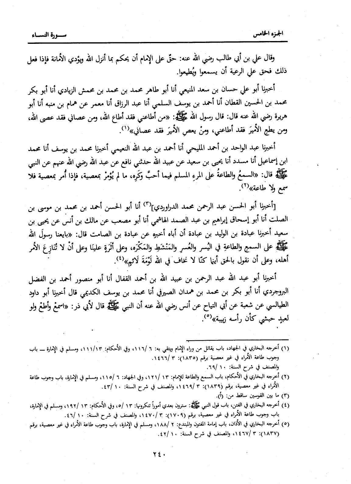 (4) أخرجه البخاري في الفتن، باب قول النبي صَلَّى اللَّهُ عَلَيْهِ وَسَلَّمَ: سترون بعدي أمورا تنكرونها: 13 / 5، وفي الأحكام: 13 / 192، ومسلم في الإمارة، باب وجوب طاعة الأمراء في غير معصية، برقم (1709) : 3 / 1470، والمصنف في شرح السنة" 10 / 46.
