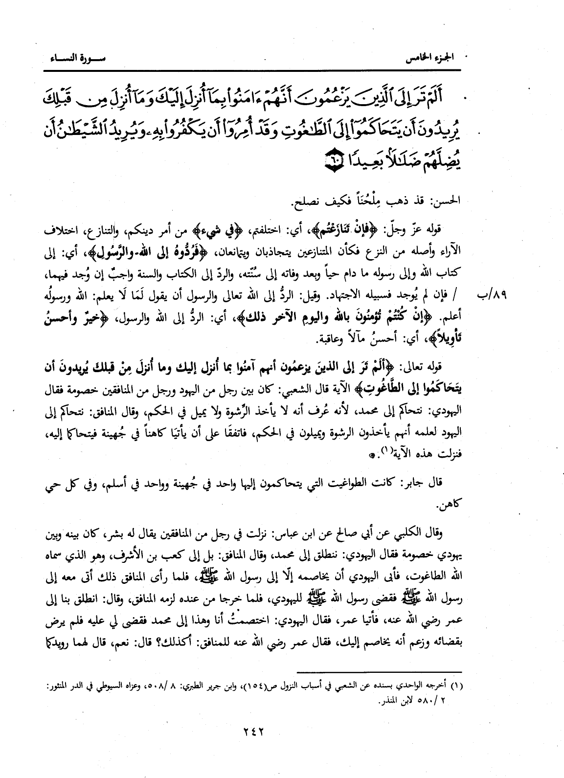 قَوْلُهُ تَعَالَى: {أَلَمْ تَرَ إِلَى الَّذِينَ يَزْعُمُونَ أَنَّهُمْ آمَنُوا بِمَا أُنْزِلَ إِلَيْكَ وَمَا أُنْزِلَ مِنْ قَبْلِكَ يُرِيدُونَ أَنْ يَتَحَاكَمُوا إِلَى الطَّاغُوتِ} الْآيَةَ قَالَ الشَّعْبِيُّ: كَانَ بَيْنَ رَجُلٍ مِنَ الْيَهُودِ وَرَجُلٍ مِنَ الْمُنَافِقِينَ خُصُومَةٌ فَقَالَ الْيَهُودِيُّ: نَتَحَاكَمُ إِلَى مُحَمَّدٍ، لِأَنَّهُ عَرَفَ أَنَّهُ لَا يَأْخُذُ الرَّشْوَةَ وَلَا يَمِيلُ فِي الْحُكْمِ، وَقَالَ الْمُنَافِقُ: نَتَحَاكَمُ إِلَى الْيَهُودِ لِعِلْمِهِ أَنَّهُمْ يَأْخُذُونَ الرَّشْوَةَ وَيَمِيلُونَ فِي الْحُكْمِ، فَاتَّفَقَا عَلَى أَنَّ يَأْتِيَا كَاهِنًا فِي جُهَيْنَةَ فَيَتَحَاكَمَا إِلَيْهِ، فَنَزَلَتْ هَذِهِ الْآيَةُ (1) .