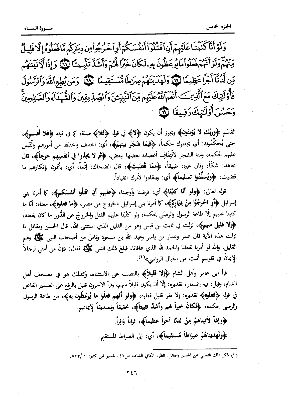 قَوْلُهُ تَعَالَى: {وَلَوْ أَنَّا كَتَبْنَا} أَيْ: فَرَضْنَا وَأَوْجَبْنَا، {عَلَيْهِمْ أَنِ اقْتُلُوا أَنْفُسَكُمْ} كَمَا أَمَرْنَا بَنِي إِسْرَائِيلَ {أَوِ اخْرُجُوا مِنْ دِيَارِكُمْ} كَمَا أَمَرْنَا بَنِي إِسْرَائِيلَ بِالْخُرُوجِ مِنْ مِصْرَ، {مَا فَعَلُوهُ} مَعْنَاهُ: أَنَّا مَا كَتَبْنَا عَلَيْهِمْ إِلَّا طَاعَةَ الرَّسُولِ وَالرِّضَى بِحُكْمِهِ، وَلَوْ كَتَبْنَا عَلَيْهِمُ الْقَتْلَ وَالْخُرُوجَ عَنِ الدَّوْرِ مَا كَانَ يَفْعَلُهُ، {إِلَّا قَلِيلٌ مِنْهُمْ} نَزَلَتْ فِي ثَابِتِ بْنِ قَيْسٍ وَهُوَ مِنَ الْقَلِيلِ الَّذِي اسْتَثْنَى اللَّهُ، قَالَ الْحَسَنُ وَمُقَاتِلٌ لِمَا نَزَلَتْ هَذِهِ الْآيَةُ قَالَ عُمَرُ وَعَمَّارُ بْنُ يَاسِرٍ وَعَبْدُ اللَّهِ بْنُ مَسْعُودٍ وَنَاسٌ مِنْ أَصْحَابِ النَّبِيِّ صَلَّى اللَّهُ عَلَيْهِ وَسَلَّمَ وَهُمُ الْقَلِيلُ، وَاللَّهِ لَوْ أَمَرَنَا لَفَعَلْنَا وَالْحَمْدُ لِلَّهِ الَّذِي عَافَانَا، فَبَلَغَ ذَلِكَ النَّبِيَّ صَلَّى اللَّهُ عَلَيْهِ وَسَلَّمَ فَقَالَ: "إِنَّ مِنْ أُمَّتِي لَرِجَالًا الْإِيمَانُ فِي قُلُوبِهِمْ أَثْبَتُ مِنَ الْجِبَالِ الرَّوَاسِي" (1) .