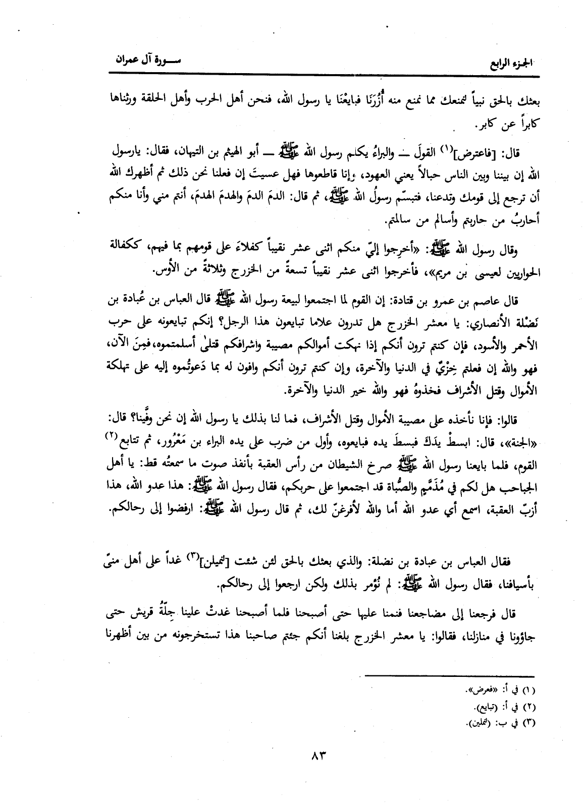 قَالَ عَاصِمُ بْنُ عَمْرِو بْنِ قَتَادَةَ: إِنَّ الْقَوْمَ لَمَّا اجْتَمَعُوا لِبَيْعَةِ رَسُولِ اللَّهِ صَلَّى اللَّهُ عَلَيْهِ وَسَلَّمَ قَالَ الْعَبَّاسُ بْنُ عُبَادَةَ بْنِ نَضْلَةَ الْأَنْصَارِيُّ: يَا مَعْشَرَ الْخَزْرَجِ هَلْ تَدْرُونَ عَلَامَا تُبَايِعُونَ هَذَا الرَّجُلَ؟ إِنَّكُمْ تُبَايِعُونَهُ عَلَى حَرْبِ الْأَحْمَرِ وَالْأَسْوَدِ، فَإِنْ كُنْتُمْ تَرَوْنَ أَنَّكُمْ إِذَا نَهَكَتْ أَمْوَالَكُمْ مُصِيبَةٌ وَأَشْرَافَكُمْ قَتْلَى أَسْلَمْتُمُوهُ، فَمِنَ الْآنَ، فَهُوَ وَاللَّهِ إِنْ فَعَلْتُمْ خِزْيٌ فِي الدُّنْيَا وَالْآخِرَةِ، وَإِنْ كُنْتُمْ تَرَوْنَ أَنَّكُمْ وَافُونَ لَهُ بِمَا دَعَوْتُمُوهُ إِلَيْهِ مِنْ تَهْلُكَةِ الْأَمْوَالِ وَقَتْلِ الْأَشْرَافِ فَخُذُوهُ فَهُوَ وَاللَّهِ خَيْرُ الدُّنْيَا وَالْآخِرَةِ.