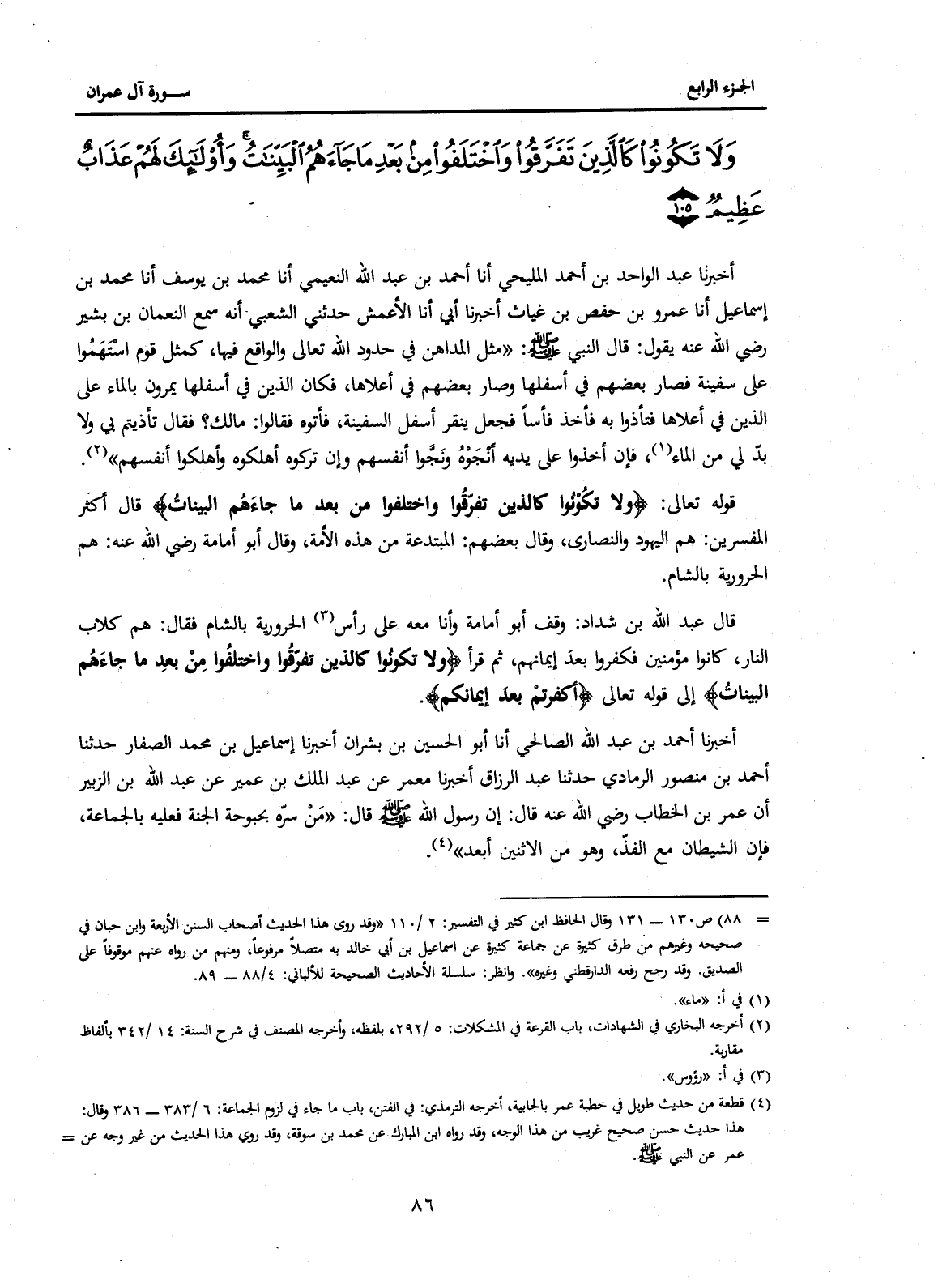 قَوْلُهُ تَعَالَى: {وَلَا تَكُونُوا كَالَّذِينَ تَفَرَّقُوا وَاخْتَلَفُوا مِنْ بَعْدِ مَا جَاءَهُمُ الْبَيِّنَاتُ} قَالَ أَكْثَرُ الْمُفَسِّرِينَ: هُمُ الْيَهُودُ وَالنَّصَارَى، وَقَالَ بَعْضُهُمُ: الْمُبْتَدِعَةُ مِنْ هَذِهِ الْأُمَّةِ، وَقَالَ أَبُو أُمَامَةَ رَضِيَ اللَّهُ عَنْهُ هُمُ الْحَرُورِيَّةُ بِالشَّامِ.