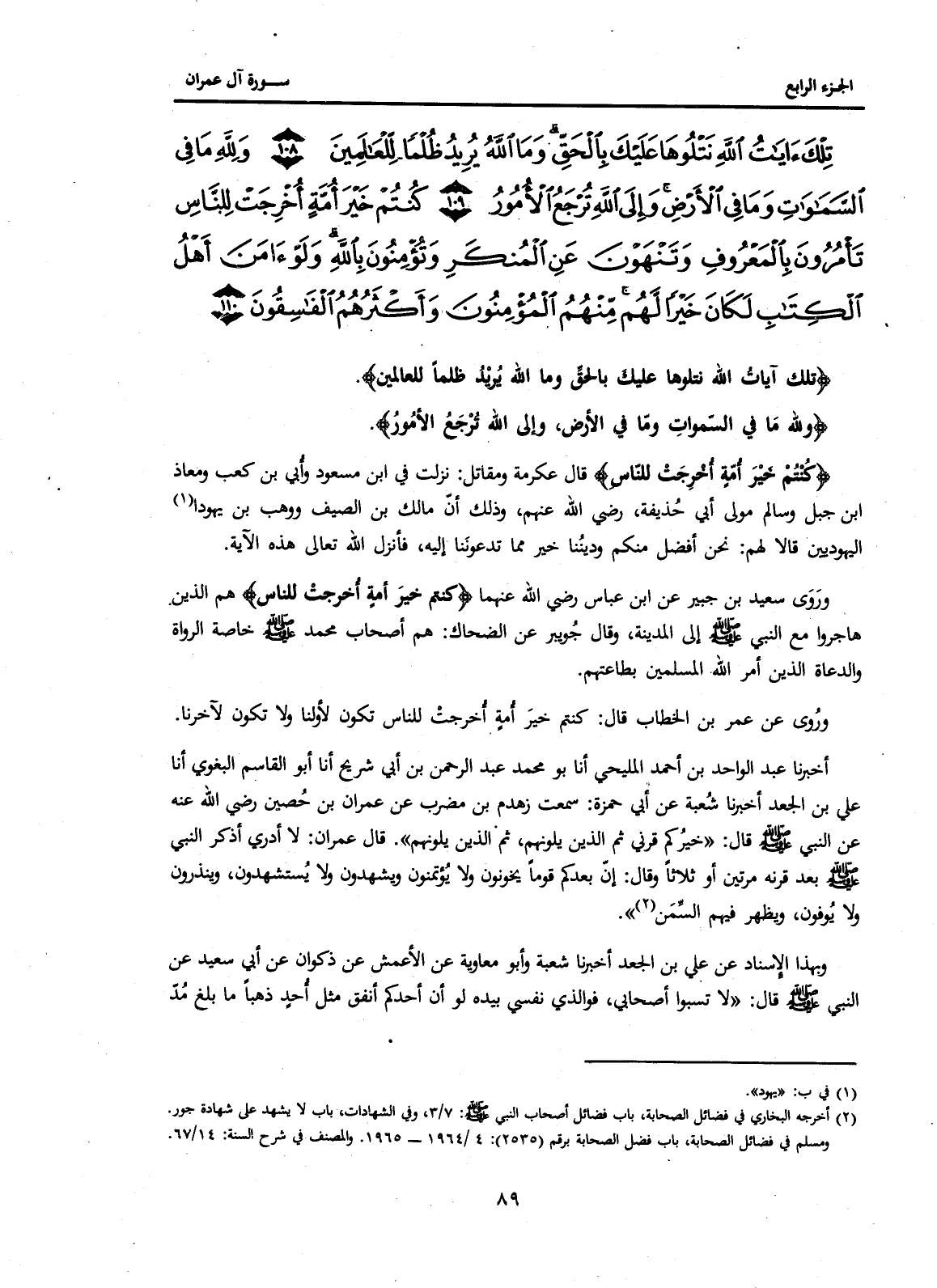وَرَوَى سَعِيدُ بْنُ جُبَيْرٍ عَنِ ابْنِ عَبَّاسٍ رَضِيَ اللَّهُ عَنْهُمَا {كُنْتُمْ خَيْرَ أُمَّةٍ أُخْرِجَتْ لِلنَّاسِ} الَّذِينَ هَاجَرُوا مَعَ النَّبِيِّ صَلَّى اللَّهُ عَلَيْهِ وَسَلَّمَ إِلَى الْمَدِينَةِ، وَقَالَ جُوَيْبِرٌ عَنِ الضَّحَّاكِ: هُمْ أَصْحَابُ مُحَمَّدٍ صَلَّى اللَّهُ عَلَيْهِ وَسَلَّمَ خَاصَّةً الرُّوَاةُ وَالدُّعَاةُ الَّذِينَ أَمَرَ اللَّهُ الْمُسْلِمِينَ بِطَاعَتِهِمْ.