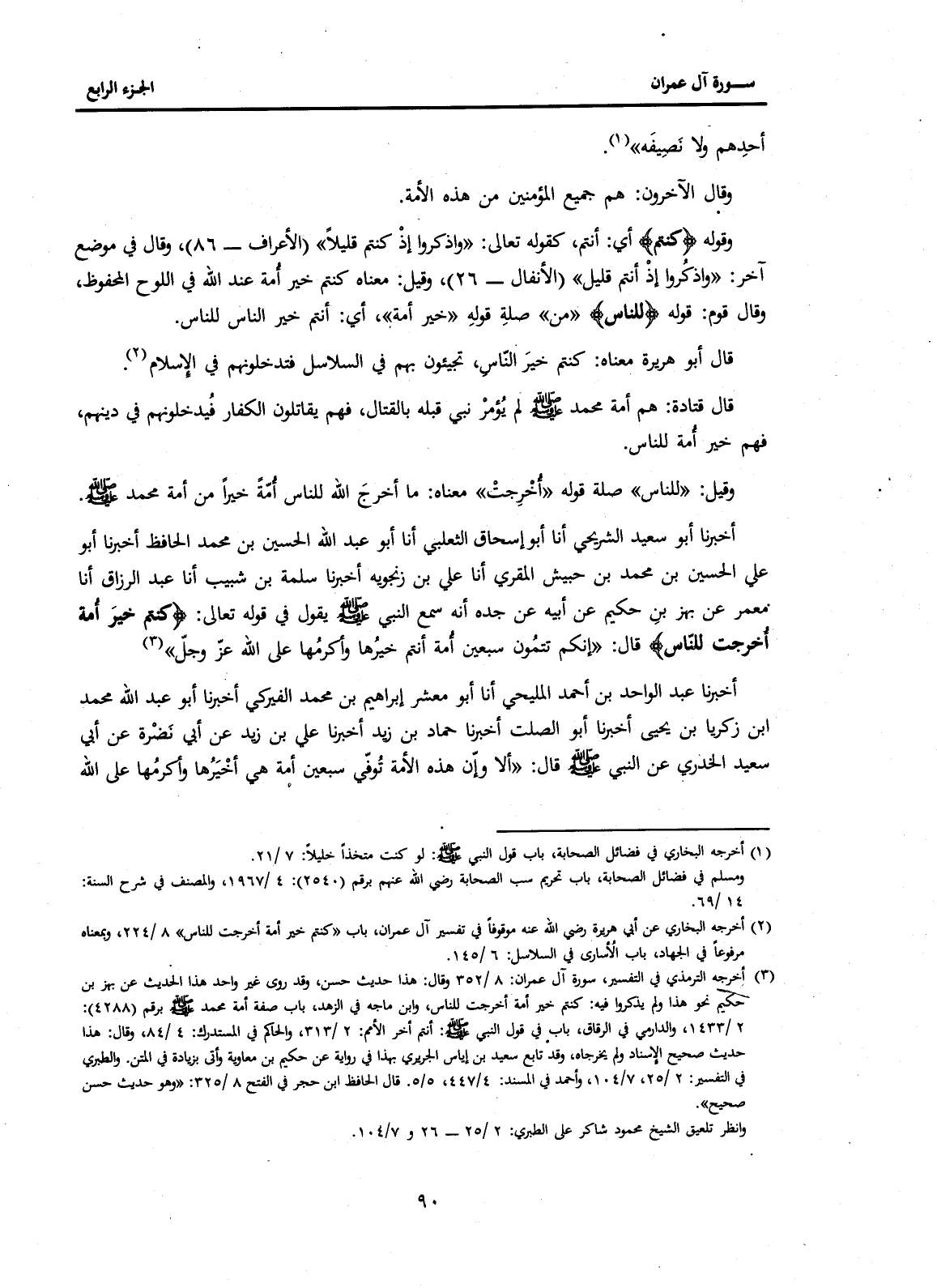 (3) أخرجه الترمذي في التفسير سورة آل عمران: 8 / 352 وقال: هذا حديث حسن وقد روى غير واحد هذا الحديث عن بهز بن حكيم نحو هذا ولم يذكروا فيه: كنتم خير أمة أخرجت للناس وابن ماجه في الزهد باب صفة أمة محمد صَلَّى اللَّهُ عَلَيْهِ وَسَلَّمَ برقم (4288) : 2 / 1433، والدارمي في الرقاق باب في قول النبي صَلَّى اللَّهُ عَلَيْهِ وَسَلَّمَ: أنتم آخر الأمم: 2 / 313 والحاكم في المستدرك: 4 / 84 وقال: هذا حديث صحيح الإسناد ولم يخرجاه، وقد تابع سعيد بن إياس الجريري بهذا في رواية عن حكيم بن معاوية وأتى بزيادة في المتن. والطبري في التفسير: 2 / 25، 7 / 104 وأحمد في المسند: 4 / 447، 5 / 5. قال الحافظ ابن حجر في الفتح 8 / 325: "وهو حديث حسن صحيح". وانظر تعليق الشيخ محمود شاكر على الطبري: 2 / 25 - 26 و7 / 104.