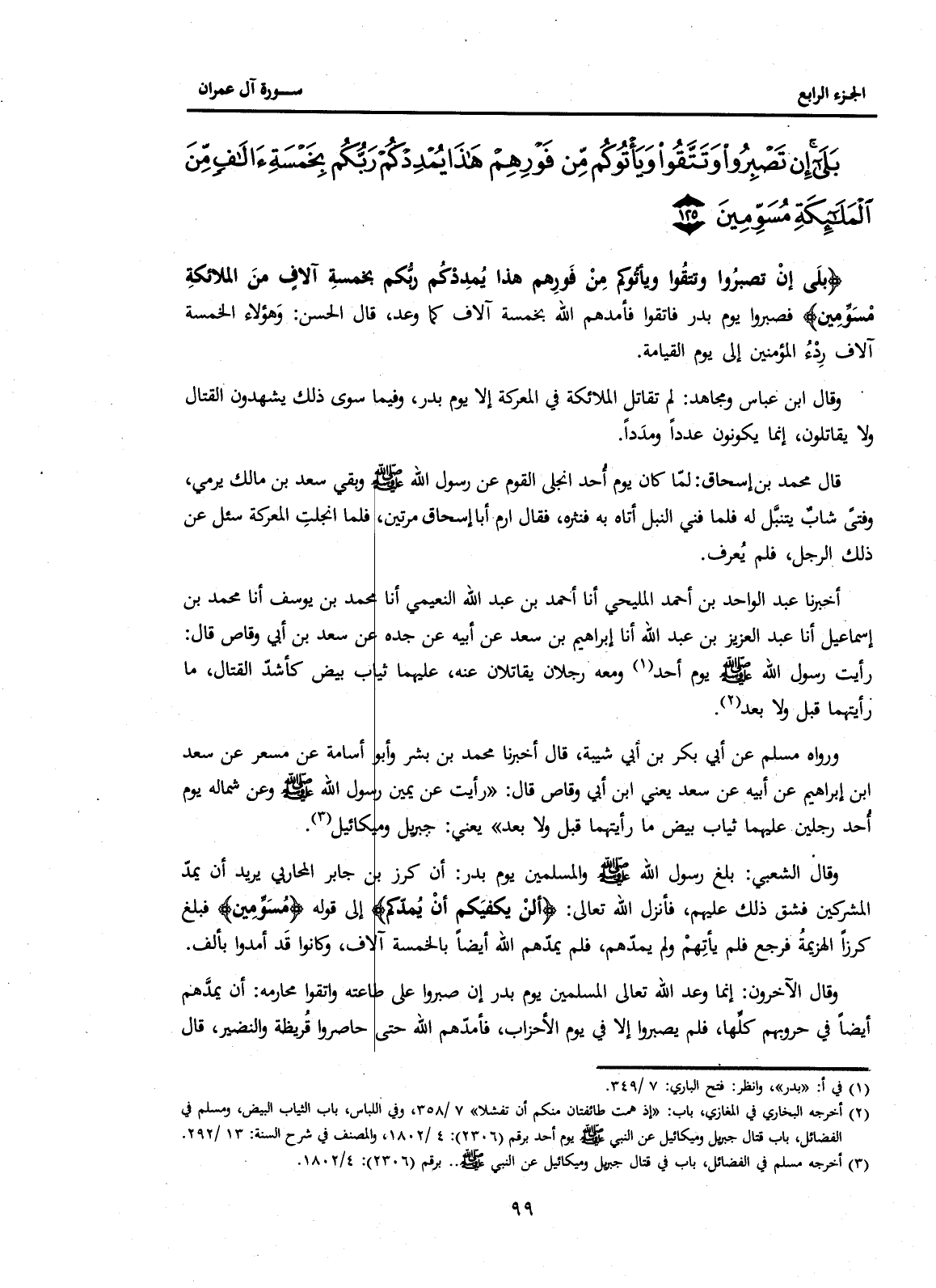 {بَلَى إِنْ تَصْبِرُوا وَتَتَّقُوا وَيَأْتُوكُمْ مِنْ فَوْرِهِمْ هَذَا يُمْدِدْكُمْ رَبُّكُمْ بِخَمْسَةِ آلَافٍ مِنَ الْمَلَائِكَةِ مُسَوِّمِينَ} فَصَبَرُوا يَوْمَ بَدْرٍ فَاتَّقَوْا فَأَمَدَّهُمُ اللَّهُ بِخَمْسَةِ آلَافٍ كَمَا وَعَدَ قَالَ الْحَسَنُ: وَهَؤُلَاءِ الْخَمْسَةُ آلَافٍ رِدْءُ الْمُؤْمِنِينَ إِلَى يَوْمِ الْقِيَامَةِ.