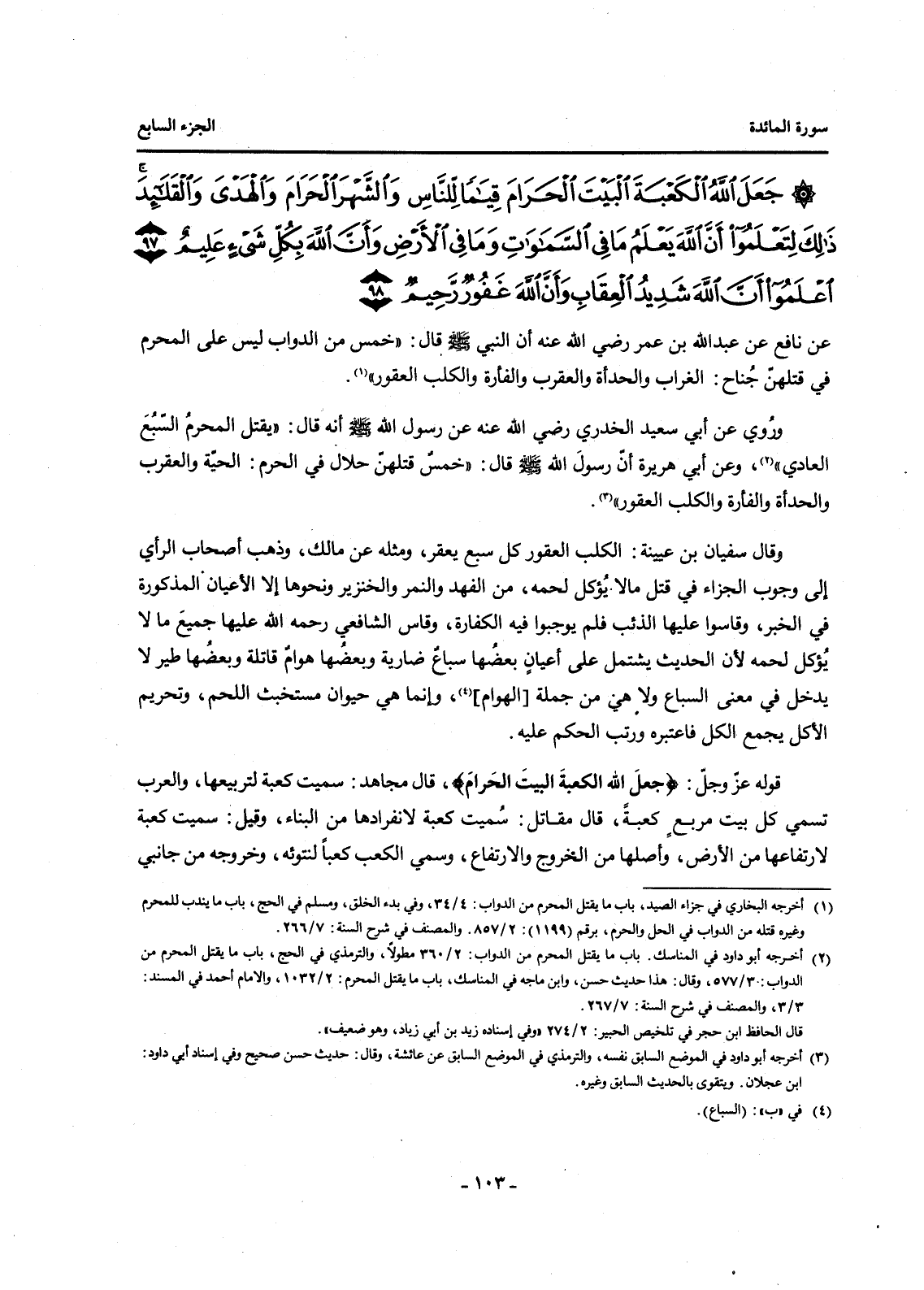 {جَعَلَ اللَّهُ الْكَعْبَةَ الْبَيْتَ الْحَرَامَ قِيَامًا لِلنَّاسِ وَالشَّهْرَ الْحَرَامَ وَالْهَدْيَ وَالْقَلَائِدَ ذَلِكَ لِتَعْلَمُوا أَنَّ اللَّهَ يَعْلَمُ مَا فِي السَّمَاوَاتِ وَمَا فِي الْأَرْضِ وَأَنَّ اللَّهَ بِكُلِّ شَيْءٍ عَلِيمٌ (97) اعْلَمُوا أَنَّ اللَّهَ شَدِيدُ الْعِقَابِ وَأَنَّ اللَّهَ غَفُورٌ رَحِيمٌ (98) }