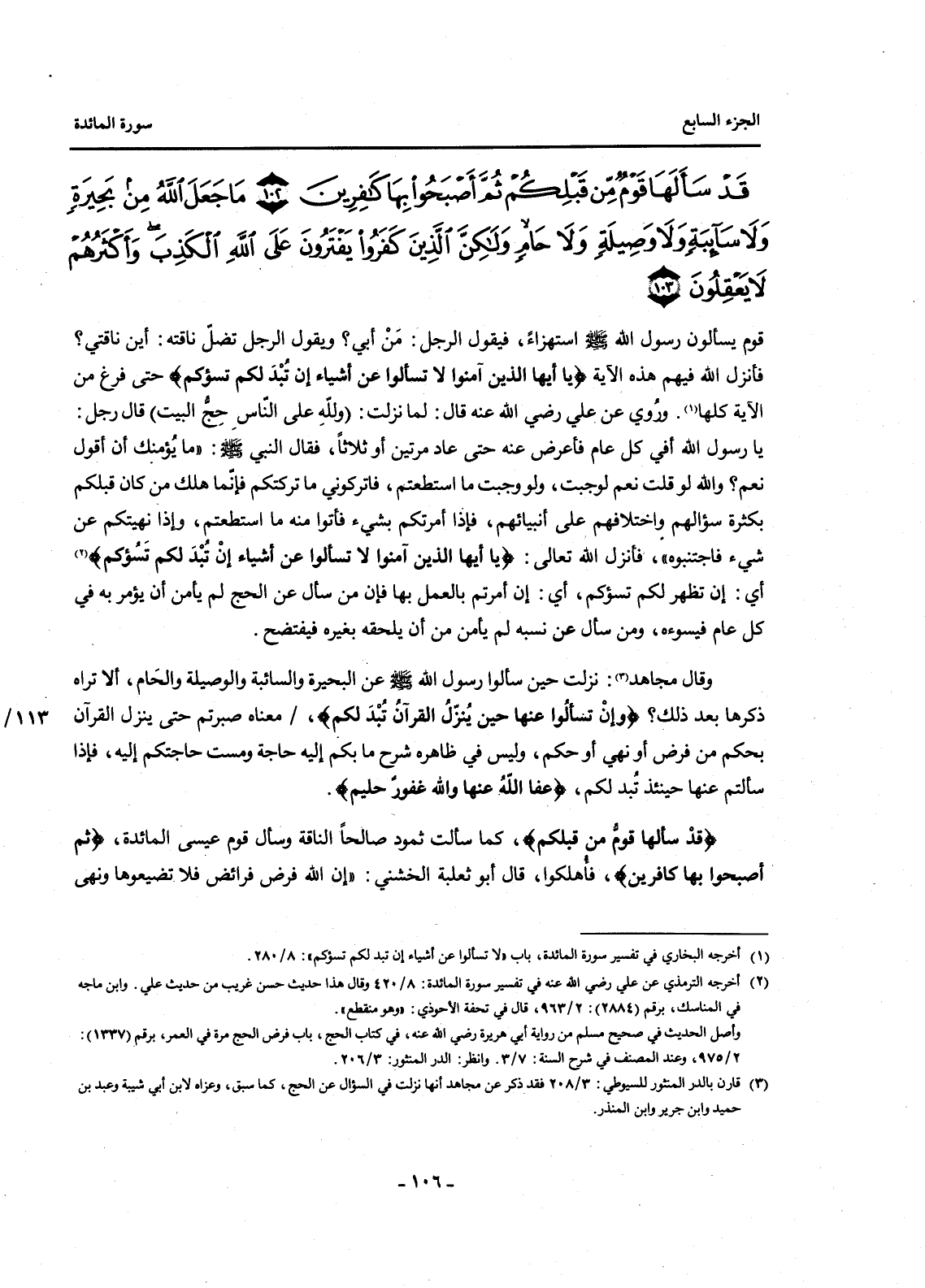 (1) أخرجه البخاري في تفسير سورة المائدة، باب "لا تسألوا عن أشياء إن تبد لكم تسؤكم": 8 / 280.