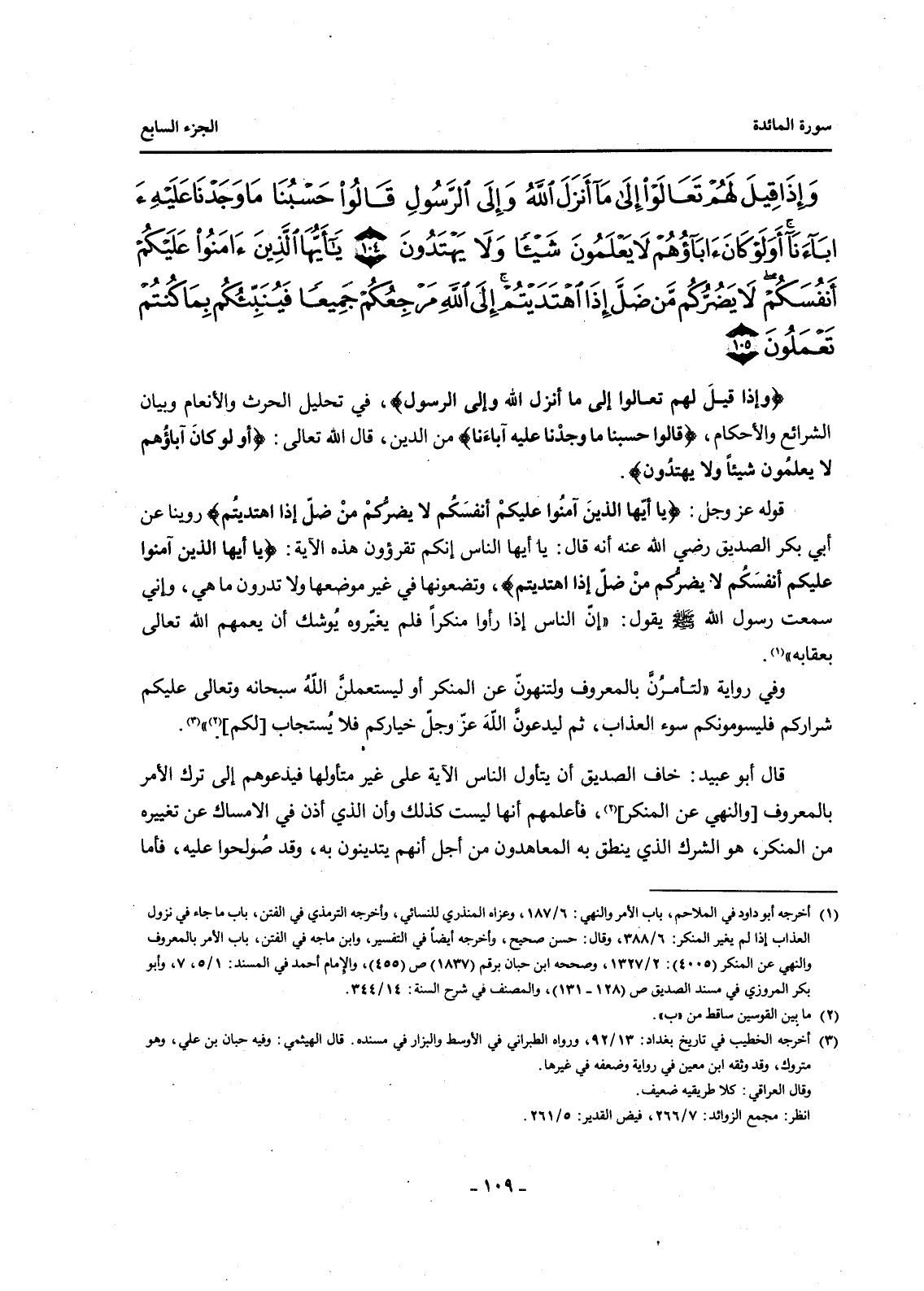 قَوْلُهُ عَزَّ وَجَلَّ: {يَا أَيُّهَا الَّذِينَ آمَنُوا عَلَيْكُمْ أَنْفُسَكُمْ لَا يَضُرُّكُمْ مَنْ ضَلَّ إِذَا اهْتَدَيْتُمْ} رُوِّينَا عَنْ أَبِي بَكْرٍ الصِّدِّيقِ رَضِيَ اللَّهُ عَنْهُ أَنَّهُ قَالَ: يَا أَيُّهَا النَّاسُ إِنَّكُمْ تَقْرَءُونَ هَذِهِ الْآيَةَ: {يَا أَيُّهَا الَّذِينَ آمَنُوا عَلَيْكُمْ أَنْفُسَكُمْ لَا يَضُرُّكُمْ مَنْ ضَلَّ إِذَا اهْتَدَيْتُمْ} وَتَضَعُونَهَا فِي غَيْرِ مَوْضِعِهَا وَلَا تَدْرُونَ مَا هِيَ، وَإِنِّي سَمِعْتُ رَسُولَ اللَّهِ صَلَّى اللَّهُ عَلَيْهِ وَسَلَّمَ يَقُولُ: "إِنَّ النَّاسَ إِذَا رَأَوْا مُنْكَرًا فَلَمْ يُغَيِّرُوهُ يُوشِكُ أَنْ يَعُمَّهُمُ اللَّهُ تَعَالَى بِعِقَابِهِ" (1) .