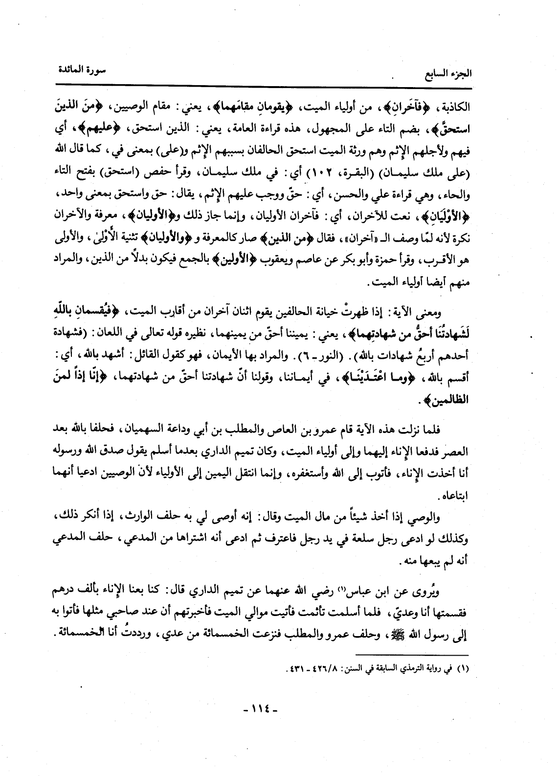 وَيُرْوَى عَنِ ابْنِ عَبَّاسٍ (1) رَضِيَ اللَّهُ عَنْهُمَا عَنْ تَمِيمٍ الدَّارِيِّ قَالَ: كُنَّا بِعْنَا الْإِنَاءَ بِأَلْفِ دِرْهَمٍ فَقَسَّمْتُهَا أَنَا وَعَدِيٌّ، فَلَمَّا أَسْلَمْتُ تَأَثَّمْتُ فَأَتَيْتُ مَوَالِيَ الْمَيِّتِ فَأَخْبَرْتُهُمْ أَنَّ عِنْدَ صَاحِبِي مَثَلَهَا فَأَتَوْا بِهِ إِلَى رَسُولِ اللَّهِ صَلَّى اللَّهُ عَلَيْهِ وَسَلَّمَ، وَحَلَفَ عَمْرٌو وَالْمُطَّلِبُ فَنَزَعْتُ الْخَمْسَمِائَةٍ مِنْ عَدِيٍّ، وَرَدَدْتُ أَنَا الْخَمْسَمِائَةَ.