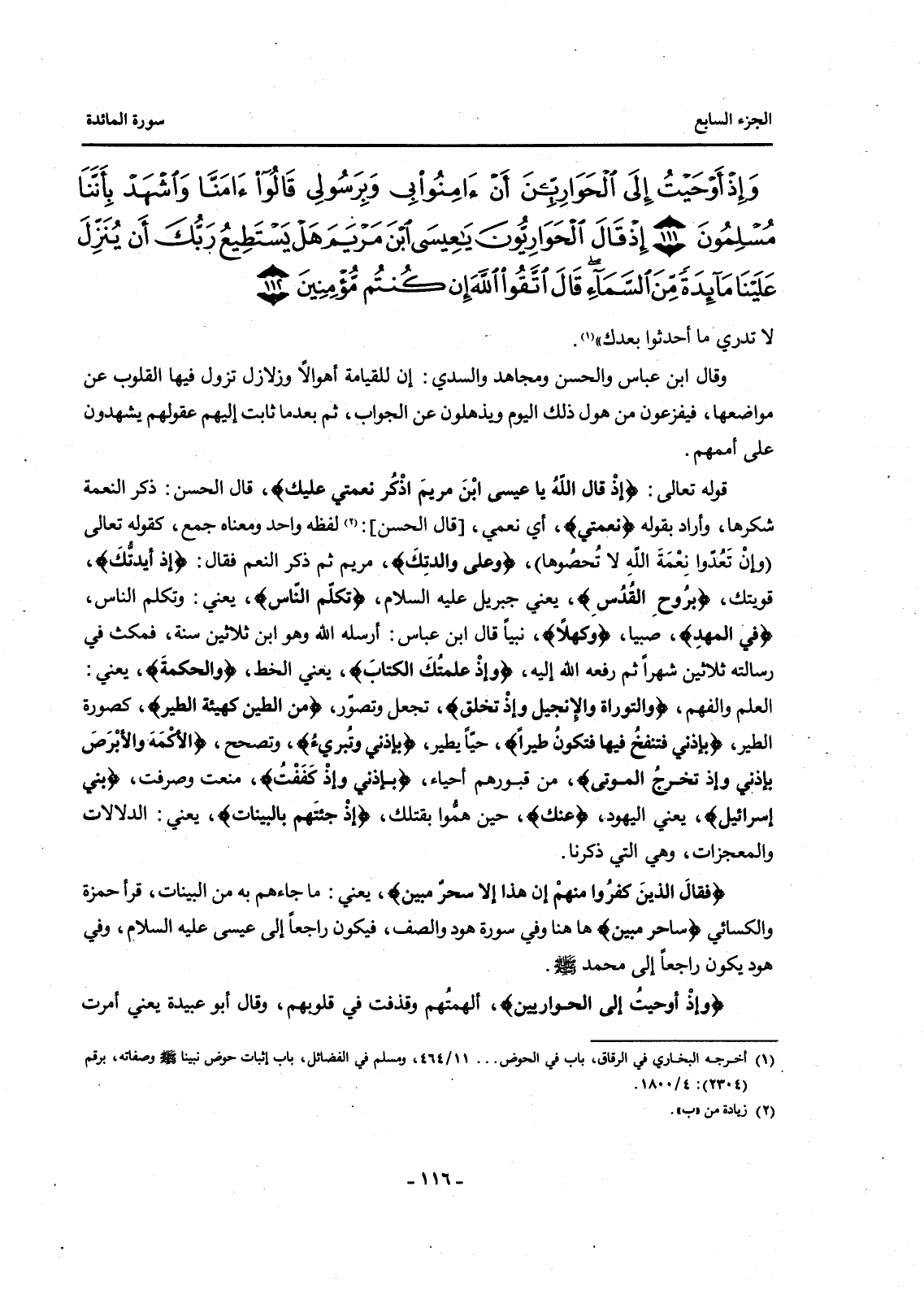 قَوْلُهُ تَعَالَى: {إِذْ قَالَ اللَّهُ يَا عِيسَى ابْنَ مَرْيَمَ اذْكُرْ نِعْمَتِي عَلَيْكَ} قَالَ الْحَسَنُ: ذِكْرُ النِّعْمَةِ شُكْرُهَا، وَأَرَادَ بِقَوْلِهِ {نِعْمَتِي} أَيْ: نِعَمِي، [قَالَ الْحَسَنُ] (2) لَفْظُهُ وَاحِدٌ وَمَعْنَاهُ جَمْعٌ، كَقَوْلِهِ تَعَالَى: (وَإِنْ تَعُدُّوا نِعْمَةَ اللَّهِ لَا تُحْصُوهَا) ، {وَعَلَى وَالِدَتِكَ} مَرْيَمَ ثُمَّ ذَكَرَ النِّعَمَ فَقَالَ: {إِذْ أَيَّدْتُكَ} قَوَّيْتُكَ، {بِرُوحِ الْقُدُسِ} يَعْنِي جِبْرِيلَ عَلَيْهِ السَّلَامُ، {تُكَلِّمُ النَّاسَ} يَعْنِي: وَتُكَلِّمُ النَّاسَ، {فِي الْمَهْدِ} صَبِيًّا، {وَكَهْلًا} نَبِيًّا قَالَ ابْنُ عَبَّاسٍ: أَرْسَلَهُ وَهُوَ ابْنُ ثَلَاثِينَ سَنَةً، فَمَكَثَ فِي رِسَالَتِهِ ثَلَاثِينَ شَهْرًا ثُمَّ رَفَعَهُ اللَّهُ إِلَيْهِ، {وَإِذْ عَلَّمْتُكَ الْكِتَابَ} يَعْنِي الْخَطَّ، {وَالْحِكْمَةَ} يَعْنِي الْعِلْمَ وَالْفَهْمَ، {وَالتَّوْرَاةَ وَالْإِنْجِيلَ وَإِذْ تَخْلُقُ} تَجْعَلُ وَتُصَوِّرُ، {مِنَ الطِّينِ كَهَيْئَةِ الطَّيْرِ} كَصُورَةِ الطَّيْرِ، {بِإِذْنِي فَتَنْفُخُ فِيهَا فَتَكُونُ طَيْرًا} حَيًّا يَطِيرُ، {بِإِذْنِي وَتُبْرِئُ} وَتُصَحِّحُ، {الْأَكْمَهَ وَالْأَبْرَصَ بِإِذْنِي وَإِذْ تُخْرِجُ الْمَوْتَى} مِنْ قُبُورِهِمْ أَحْيَاءً، {بِإِذْنِي وَإِذْ كَفَفْتُ} مَنَعْتُ وَصَرَفْتُ، {بَنِي إِسْرَائِيلَ} يَعْنِي الْيَهُودَ، {عَنْكَ} حِينَ هَمُّوا بِقَتْلِكَ، {إِذْ جِئْتَهُمْ بِالْبَيِّنَاتِ} يَعْنِي: الدِّلَالَاتِ وَالْمُعْجِزَاتِ، وَهِيَ الَّتِي ذَكَرْنَا.