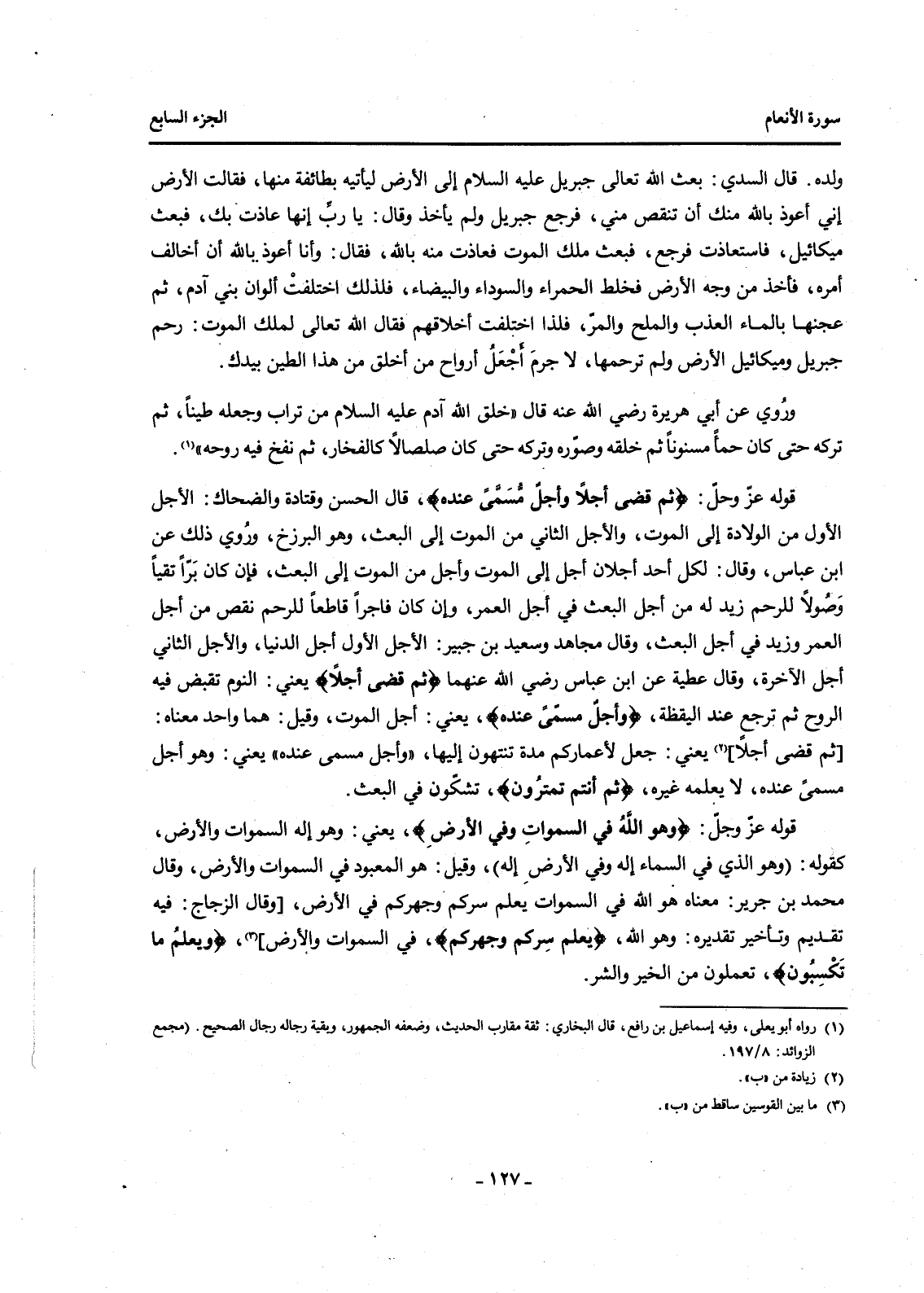 قَوْلُهُ عَزَّ وَجَلَّ: {ثُمَّ قَضَى أَجَلًا وَأَجَلٌ مُسَمًّى عِنْدَهُ} قَالَ الْحَسَنُ وَقَتَادَةُ وَالضَّحَّاكُ: الْأَجَلُ الْأَوَّلُ مِنَ الْوِلَادَةِ إِلَى الْمَوْتِ، وَالْأَجَلُ الثَّانِي مِنَ الْمَوْتِ إِلَى الْبَعْثِ، وَهُوَ الْبَرْزَخُ، وَرُوِيَ ذَلِكَ عَنِ ابْنِ عَبَّاسٍ، وَقَالَ: لِكُلِّ أَحَدٍ أَجَلَانِ أَجْلٌ إِلَى الْمَوْتِ وَأَجَلٌ مِنَ الْمَوْتِ إِلَى الْبَعْثِ، فَإِنْ كَانَ بَرًّا تَقِيًّا وَصُولًا لِلرَّحِمِ زِيدَ لَهُ مِنْ أَجَلِ الْبَعْثِ فِي أَجَلِ الْعُمْرِ، وَإِنْ كَانَ فَاجِرًا قَاطِعًا لِلرَّحِمِ نَقُصَ مِنْ أَجَلِ الْعُمْرِ وَزِيدَ فِي أَجَلِ الْبَعْثِ، وَقَالَ مُجَاهِدٌ وَسَعِيدُ بْنُ جُبَيْرٍ: الْأَجَلُ الْأَوَّلُ أَجَلُ الدُّنْيَا، وَالْأَجَلُ الثَّانِي أَجَلُ الْآخِرَةِ، وَقَالَ عَطِيَّةُ عَنِ ابْنِ عَبَّاسٍ رَضِيَ اللَّهُ عَنْهُمَا {ثُمَّ قَضَى أَجَلًا} يَعْنِي: النَّوْمَ تُقْبَضُ فِيهِ الرُّوحُ ثُمَّ تَرْجِعُ عِنْدَ الْيَقَظَةِ، {وَأَجَلٌ مُسَمًّى عِنْدَهُ} يَعْنِي: أَجْلَ الْمَوْتِ، وَقِيلَ: هُمَا وَاحِدٌ مَعْنَاهُ: [ثُمَّ قَضَى أَجَلًا] (2) يَعْنِي: جُعِلَ لِأَعْمَارِكُمْ مُدَّةً تَنْتَهُونَ إِلَيْهَا، "وَأَجَلٌ مُسَمًّى عِنْدَهُ" يَعْنِي: وَهُوَ أَجَلٌ مُسَمًّى عِنْدَهُ، لَا يَعْلَمُهُ غَيْرُهُ، {ثُمَّ أَنْتُمْ تَمْتَرُونَ} تَشُكُّونَ فِي الْبَعْثِ.