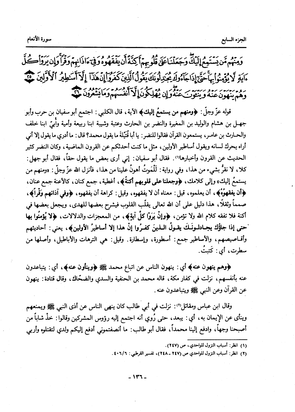 قَوْلُهُ عَزَّ وَجَلَّ: {وَمِنْهُمْ مَنْ يَسْتَمِعُ إِلَيْكَ} الْآيَةَ، قَالَ الْكَلْبِيُّ: اجْتَمَعَ أَبُو سُفْيَانَ بْنُ حَرْبٍ وَأَبُو جَهْلِ بْنُ هِشَامٍ وَالْوَلِيدُ بْنُ الْمُغِيرَةِ وَالنَّضْرُ بْنُ الْحَارِثِ وَعُتْبَةُ وَشَيْبَةُ ابْنَا رَبِيعَةَ وَأُمَيَّةُ وَأُبَيُّ ابْنَا خَلَفٍ وَالْحَارِثُ بْنُ عَامِرٍ، يَسْتَمِعُونَ الْقُرْآنَ فَقَالُوا لِلنَّضْرِ: يَا أَبَا قَتِيلَةَ مَا يَقُولُ مُحَمَّدٌ؟ قَالَ: مَا أَدْرِي مَا يَقُولُ إِلَّا أَنِّي أَرَاهُ يُحَرِّكُ لِسَانَهُ وَيَقُولُ أَسَاطِيرَ الْأَوَّلِينَ، مِثْلَ مَا كُنْتُ أُحَدِّثُكُمْ عَنِ الْقُرُونِ الْمَاضِيَةِ، وَكَانَ النَّضْرُ كَثِيرَ الْحَدِيثِ عَنِ الْقُرُونِ وَأَخْبَارِهَا (1) . فَقَالَ أَبُو سُفْيَانَ: إِنِّي أَرَى بَعْضَ مَا يَقُولُ حَقًّا، فَقَالَ أَبُو جَهْلٍ: كَلَّا لَا نُقِرُّ بِشَيْءٍ مِنْ هَذَا، وَفِي رِوَايَةٍ: لَلْمَوْتُ أَهْوَنُ عَلَيْنَا مِنْ هَذَا، فَأَنْزَلَ اللَّهُ عَزَّ وَجَلَّ: "وَمِنْهُمْ مَنْ يَسْتَمِعُ إِلَيْكَ" وَإِلَى كَلَامِكَ، {وَجَعَلْنَا عَلَى قُلُوبِهِمْ أَكِنَّةً} ، أَغْطِيَةً، جَمْعُ كِنَانٍ، كَالْأَعِنَّةِ جَمْعُ عَنَانٍ، {أَنْ يَفْقَهُوهُ} ، أَنْ يَعْلَمُوهُ، قِيلَ: مَعْنَاهُ أَنْ لَا يَفْقَهُوهُ، وَقِيلَ: كَرَاهَةَ أَنْ يَفْقَهُوهُ، {وَفِي آذَانِهِمْ وَقْرًا} ، صَمَمًا وَثِقَلًا هَذَا دَلِيلٌ عَلَى أَنَّ اللَّهَ تَعَالَى يُقَلِّبُ الْقُلُوبَ فَيَشْرَحُ بَعْضَهَا لِلْهُدَى، وَيَجْعَلُ بَعْضَهَا فِي أَكِنَّةٍ فَلَا تَفْقَهُ كَلَامَ اللَّهِ وَلَا تُؤْمِنُ، {وَإِنْ يَرَوْا كُلَّ آيَةٍ} ، مِنَ الْمُعْجِزَاتِ وَالدِّلَالَاتِ، {لَا يُؤْمِنُوا بِهَا حَتَّى إِذَا جَاءُوكَ يُجَادِلُونَكَ يَقُولُ الَّذِينَ كَفَرُوا إِنْ هَذَا إِلَّا أَسَاطِيرُ الْأَوَّلِينَ} ، يَعْنِي: أَحَادِيثَهُمْ وَأَقَاصِيصَهُمْ، وَالْأَسَاطِيرُ جَمْعُ: أُسْطُورَةٍ، وَإِسْطَارَةٍ، وَقِيلَ: هِيَ التُّرَّهَاتُ وَالْأَبَاطِيلُ، وَأَصْلُهَا مِنْ سَطَرْتُ، أَيْ: كَتَبْتُ.